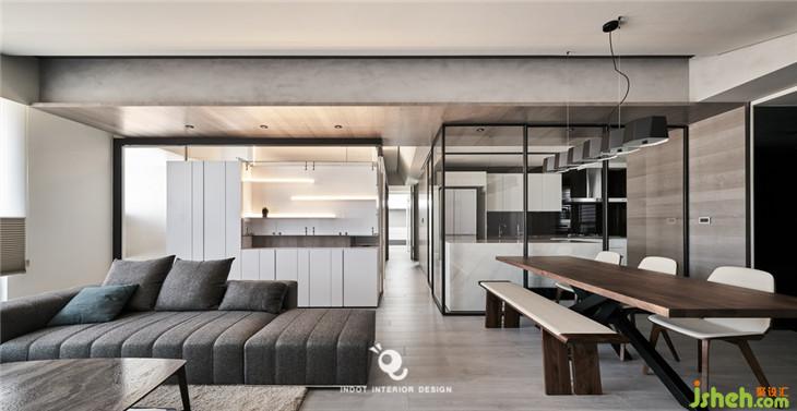 因?yàn)樘旎ǜ叩筒钜约傲旱年P(guān)系無法施作拉門軌道,所以用鐵件設(shè)計(jì)了一個(gè)軌道盒 除了可以將拉們做一個(gè)平面的整合,也可以變成一種線條延伸的造型。