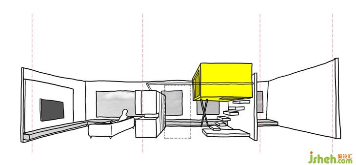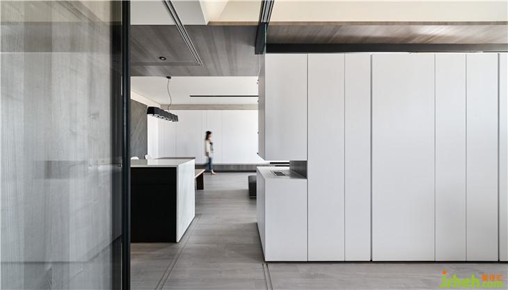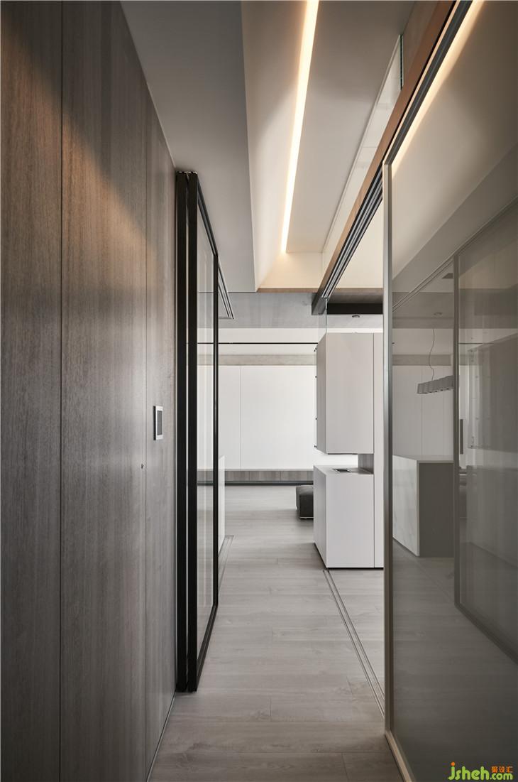 走道空間因為上方有大梁的穿過,我們沒有將它包覆,反而利用燈光及斜面的設(shè)計弱化大梁的問題,有時候梁的問題不一定要把它隱藏 ,露出來也有不同設(shè)計味道。