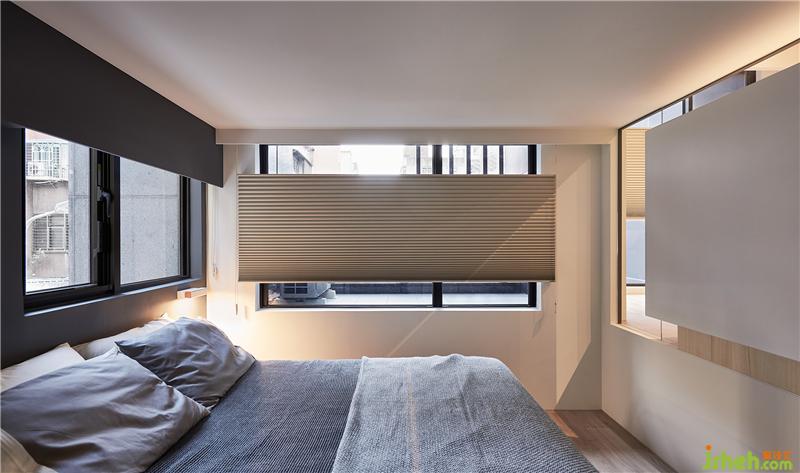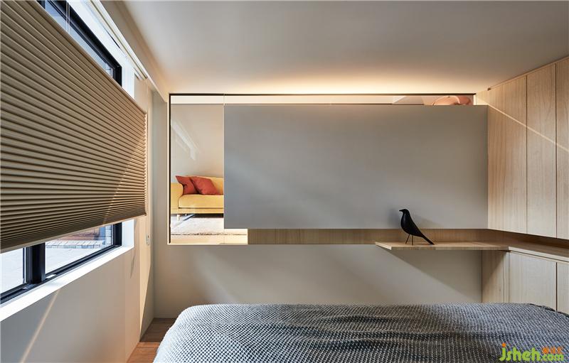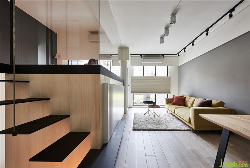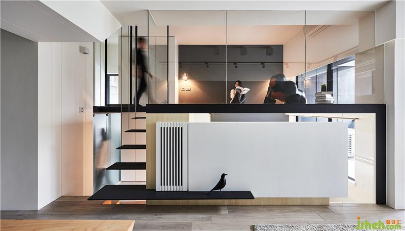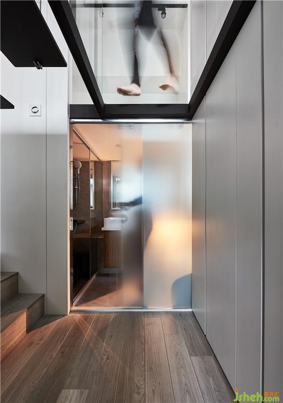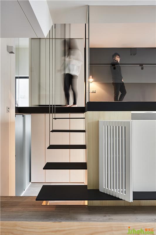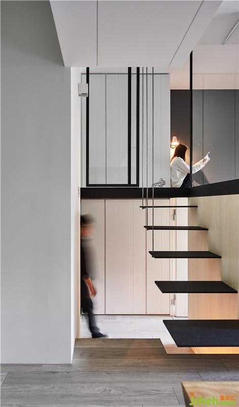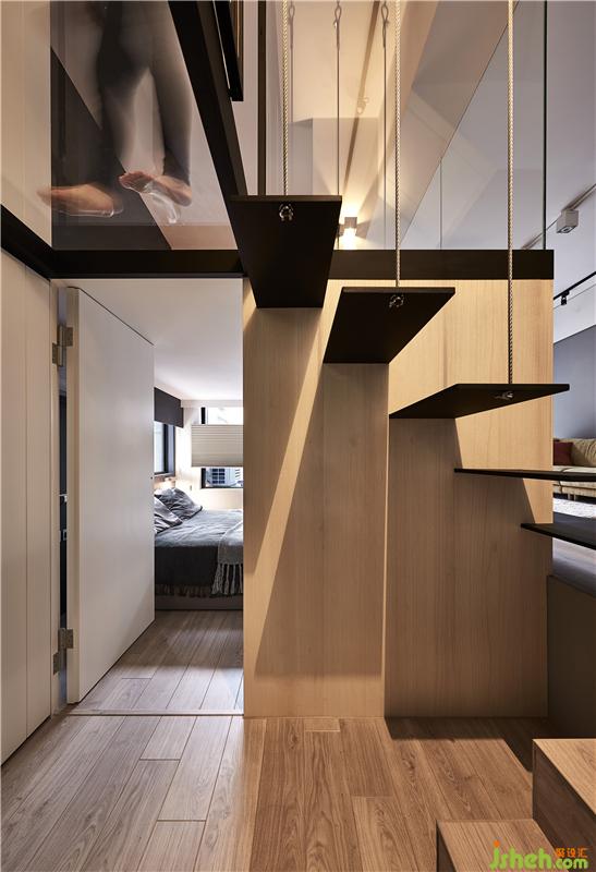 這個復層案的樓梯使用鐵板當結(jié)構(gòu),鋼索作為扶手與支撐;我們讓這懸浮的樓梯延伸到電視墻,刻意營造這樣的利落線條感樓梯下通往主臥室過道,上方使用膠合強化玻璃地坪,因為光影及人影讓這空間變得很多層次,除了穿透感可以讓下方不會那么壓迫之外,上方移動的人也在這個空間內(nèi)形成一個有趣的互動。室內(nèi)設(shè)計師