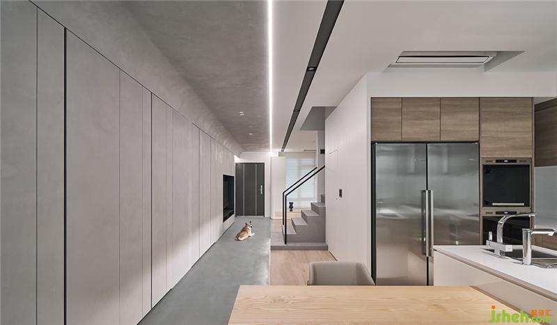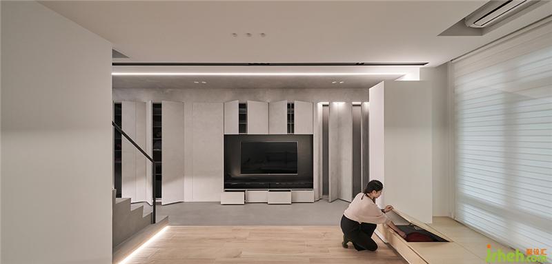 樓梯材質(zhì)一直延伸到一樓地面然后延續(xù)到牆面及天花,有一種蔓延而下的感覺(jué);樓梯左側(cè)為客廳,右側(cè)為開(kāi)放式廚房??蛷d與臥榻、書(shū)房整合,臥榻當(dāng)客人多時(shí)旁邊都可以坐一整排;在入口處我們?cè)O(shè)計(jì)了一整排收納柜,也與電視牆面跟鞋柜整合臺(tái)灣裝修設(shè)計(jì)。
