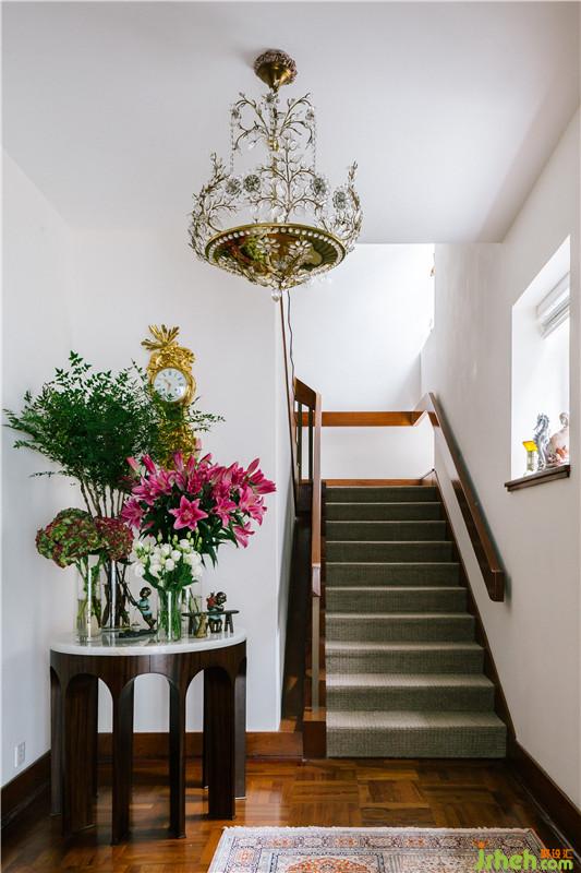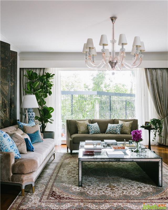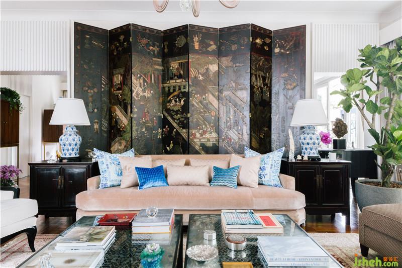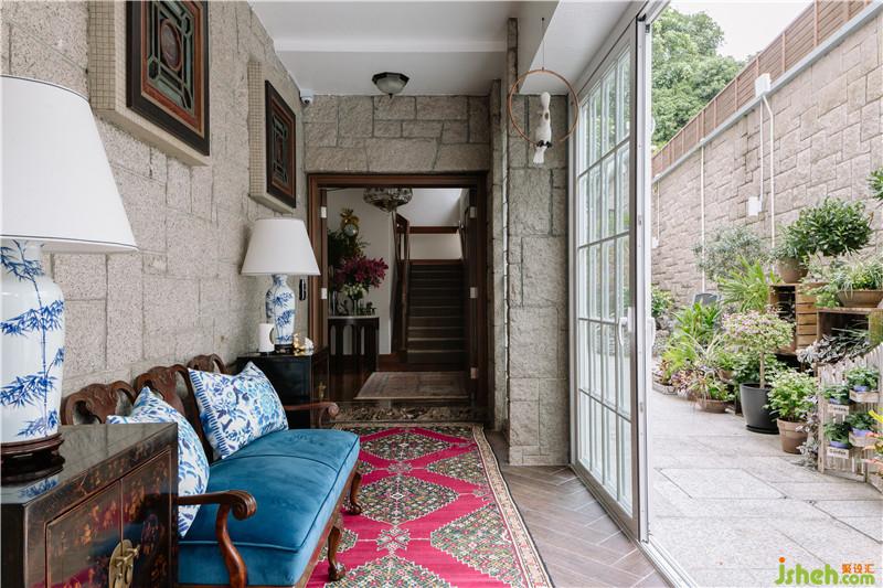 玄關(guān)區(qū)艷麗的波斯地毯,注入這棟老宅空間新的活力,換鞋椅的那抹艷藍(lán)色和地毯的玫紅有了強(qiáng)烈的沖突感,這種沖突感所組成的驚艷,讓并列兩旁描金的古董裝飾柜也有了生機(jī)和活力,青花瓷的臺(tái)燈和抱枕有了輕輕的互應(yīng),中西之美在并不大的玄關(guān)區(qū),有了這么多的內(nèi)容交措,所呈現(xiàn)SCD最善長(zhǎng)的混搭手法;倚在門(mén)廊上的白色鸚鵡,和門(mén)外自然堆起的綠植花藝,滿(mǎn)滿(mǎn)的生活情趣和氣息。設(shè)計(jì)公司