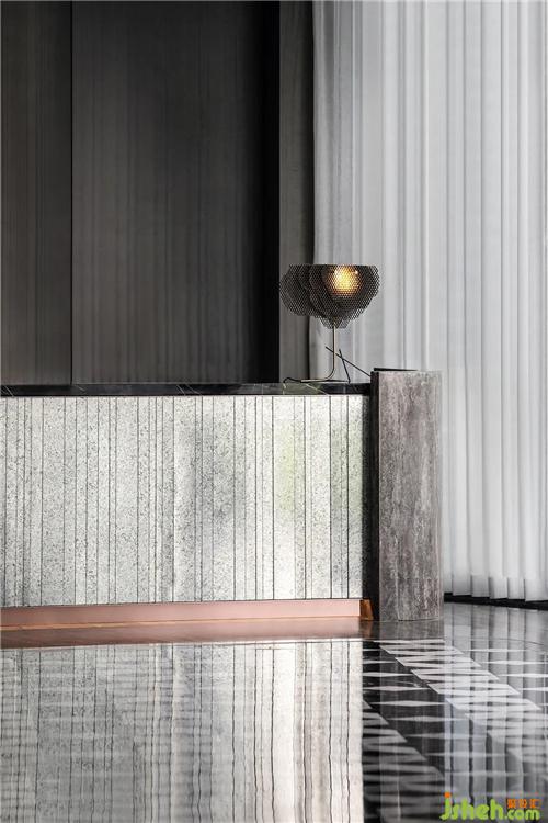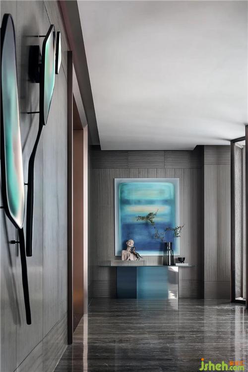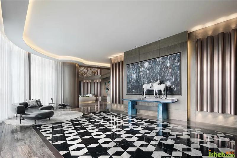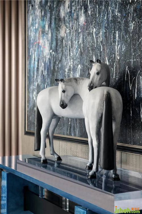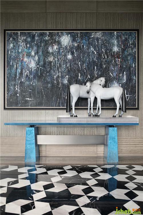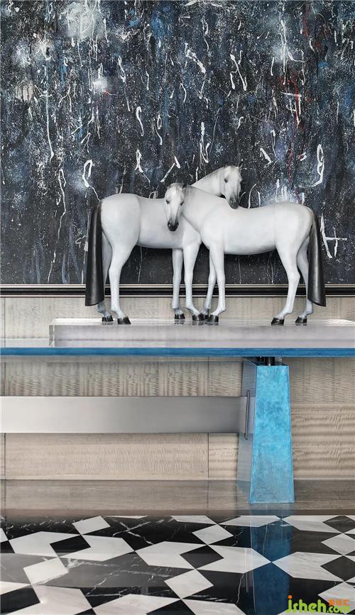 有感“片刻躊躇實(shí)為明智”,前廳入口用抽象夢(mèng)幻藍(lán)裝飾畫做背景,它的藍(lán)與玄關(guān)條案的藍(lán)的驚艷有所不同,靈動(dòng)的《依》之白馬雕塑,跟黑白拼花組合的地面成了一個(gè)夢(mèng)境般的畫面。SCD想要營(yíng)造的是在人們進(jìn)來的那一瞬間,感受到美,卻又想追問:美,是什么?