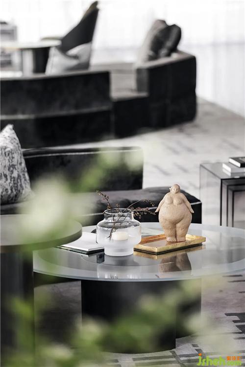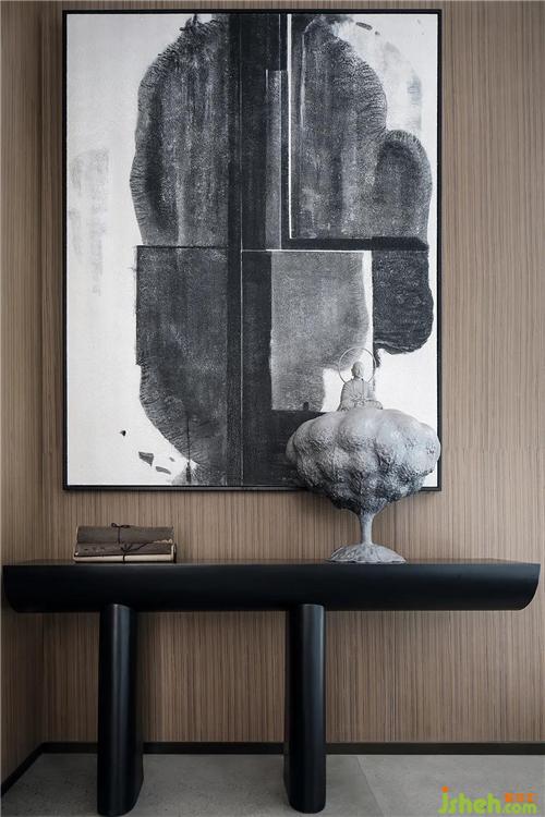 云展云舒,自由自在。云之自由正是由于其無(wú)“自性”,無(wú)所常形,自在恒在。云之狀態(tài),如我所愿。搭配高低錯(cuò)落的碳化竹子花瓶,插三兩支花開(kāi)枝葉,東莞售樓處設(shè)計(jì)配以古字垂掛裝飾品,取“風(fēng)來(lái)疏竹,風(fēng)去而竹不留聲”之意。事來(lái)心應(yīng),事去心止。藝術(shù)品并不是安靜的呆在那里,而是會(huì)引領(lǐng)我們?nèi)ジ惺苌畹姆諊???臻g本是無(wú)垠無(wú)形,作為一個(gè)設(shè)計(jì)者,也許永遠(yuǎn)只能捕捉,無(wú)法下定義,因?yàn)榫拖褚岸衫锏闹圩?,就算無(wú)人存在,也能物我相忘自在橫臥,天地兩悠悠。