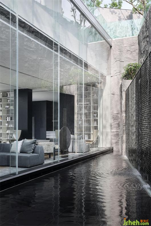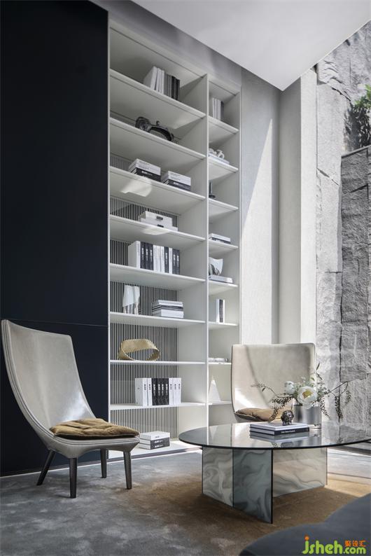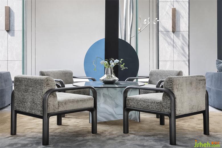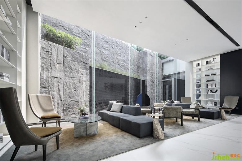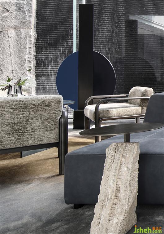 家具的細(xì)節(jié)石雕,互應(yīng)了景觀的山水造景。王安石曰“‘波’乃水之皮”,以水之皮造波瀾,堅(jiān)如石,柔如波,質(zhì)地與形態(tài)的碰撞是交融。這樣的一個(gè)洽談茶幾,亦玩味出了中國(guó)文人心中的水墨山水?!吧綏入[”這種寫(xiě)意的表達(dá)手法,也讓人頓悟設(shè)計(jì)不僅是樣式、造型、材料這些維度。它更是人心中對(duì)于山水、自然和理想生活的寫(xiě)照,打破了設(shè)計(jì)的冰冷與傲慢,變得詩(shī)意且溫暖。
