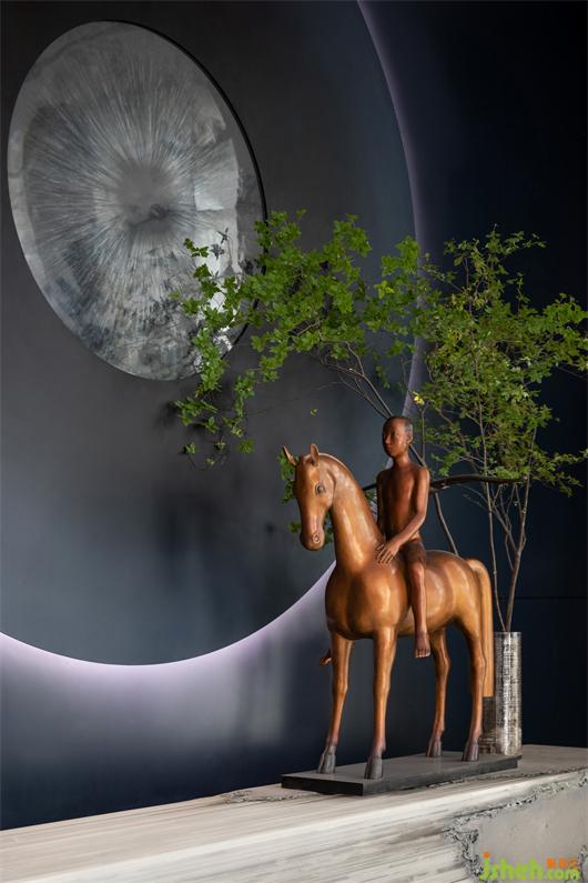 圓象征著完美,中心以瞳孔代表自省,圓的哲學(xué)定義就是開端即末尾,無論從何處開始一定要終點(diǎn)走向起點(diǎn),就像我們都不完美,所以完美是一種信仰,因?yàn)樾叛?,一直在趨向完美的路上自省;這是杜恒創(chuàng)作《瞳孔》的初心。配合藝術(shù)家張勇的雕塑《任逍遙》,營造出“獨(dú)坐幽篁里,彈琴復(fù)長嘯。深林人不知,明月來相照”的詩意氛圍。