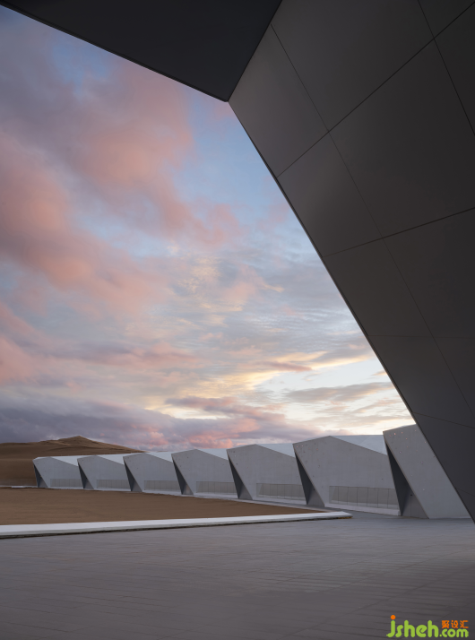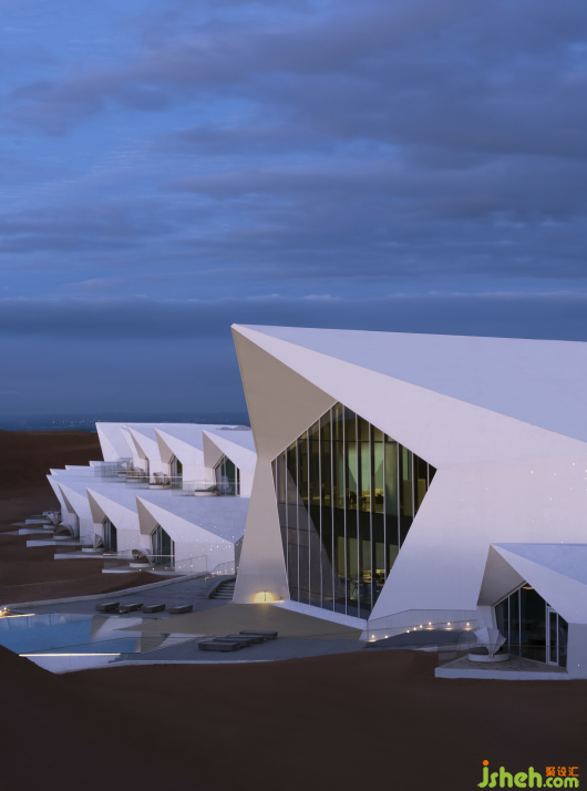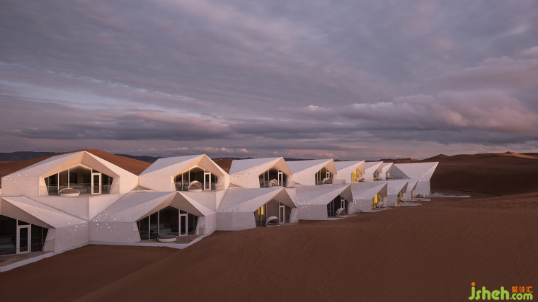 臺灣現(xiàn)代舞舞團(tuán)“云門舞集”有個舞叫《流浪者之歌》 ,用了3噸半的稻谷。它背后的創(chuàng)作故事來自于創(chuàng)始人林懷民有一次在紐約園里看到一群黑人小孩在玩沙,他就想,在舞臺上弄上沙,也很有趣的吧。對設(shè)計(jì)師杜恒來說,在沙海里弄酒店,也會很有趣。酒店的設(shè)計(jì)初衷是將建筑和室內(nèi)的氣質(zhì)糅合在一種天地大美而不言的力量感里,想象它更像是風(fēng)與沙共舞的筆觸,勾勒出有棱角有力量感的輪廓,與起伏的沙丘融為一體,展現(xiàn)出一種流動而穩(wěn)定的美。