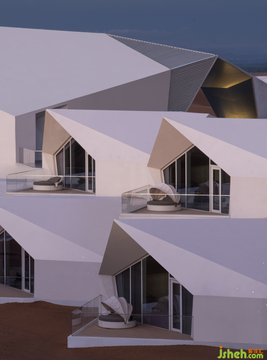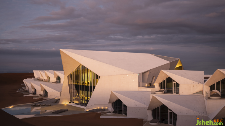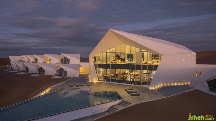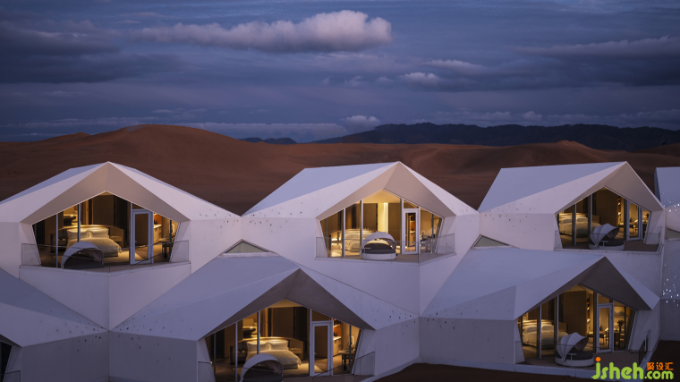 酒店設(shè)計(jì)落筆沒有試圖去改變沙漠,而是選擇與之和諧共生,利用沙漠的廣袤無垠和光影變幻,為酒店賦予了一種原始而神秘的美感。整個項(xiàng)目以充滿現(xiàn)代科技感與沙漠的自然形態(tài)完美結(jié)合,既體現(xiàn)了沙漠的壯麗和寧靜,又刷新了國內(nèi)野奢酒店的視覺系產(chǎn)品標(biāo)桿。其次,對顏值經(jīng)濟(jì)下渡度假生活的高品質(zhì)松弛感、自然場域的精神屬性的深刻理解是支撐設(shè)計(jì)師思考文旅酒店非常重要的又一個起點(diǎn)。旅游消費(fèi)已經(jīng)進(jìn)入“顏值經(jīng)濟(jì)”、審美新時(shí)代,對于自己設(shè)計(jì)的第一個文旅酒店,杜恒深入挖掘了寧夏文旅IP“星星的故鄉(xiāng)”這一文化元素,引入設(shè)計(jì)美學(xué)、生活美學(xué),講述鉆石的故事,營造極致浪漫想象的場景,讓旅人走進(jìn)這個故事,喜歡這個場景,且成為故事和場景的參與者、體驗(yàn)者和共享者。一個好的項(xiàng)目產(chǎn)品不僅要持續(xù)滿足用戶所需,也要能夠持續(xù)產(chǎn)生穩(wěn)定的傳播能力,具備自我持續(xù)獲客推廣能力。這種綜合能力的打造,靠的不僅僅是設(shè)計(jì)美感,更重要的是設(shè)計(jì)師對市場需求的熟悉和把握,也是鉆石酒店成功的一個必然因素。