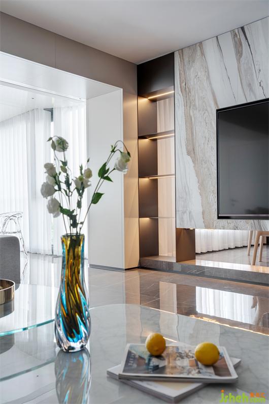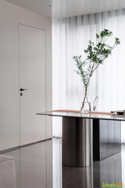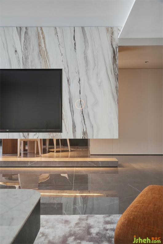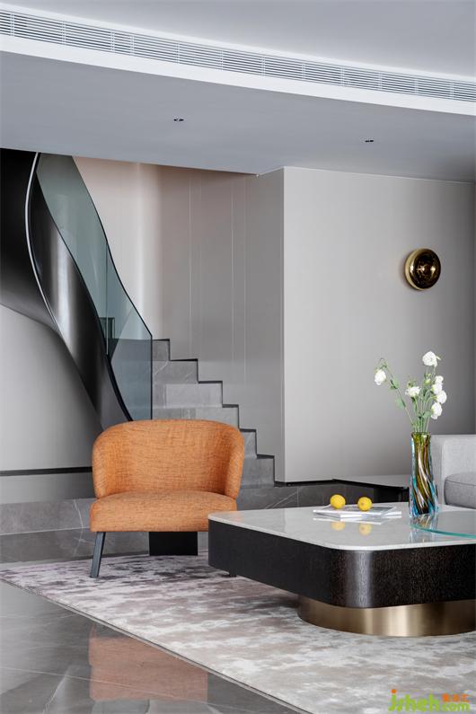 樓梯作為空間主軸,上下聯(lián)合,家居裝修采用暖灰色瓷磚鋪設(shè),搭配暖光腳燈,含蓄而張揚。
