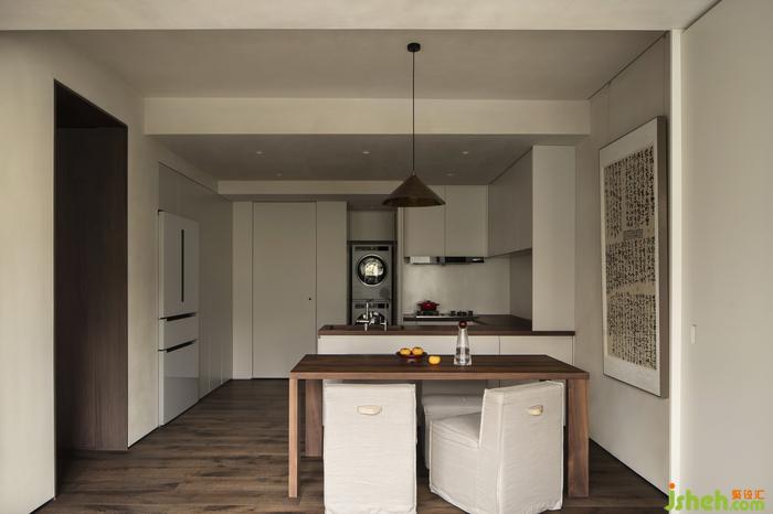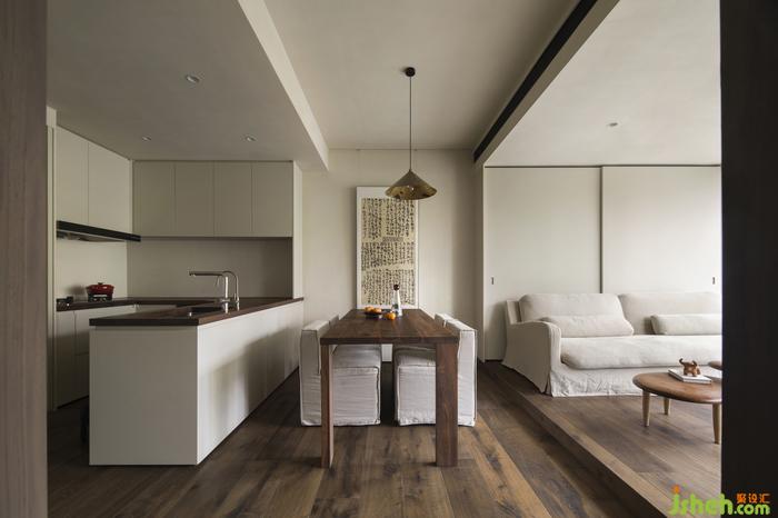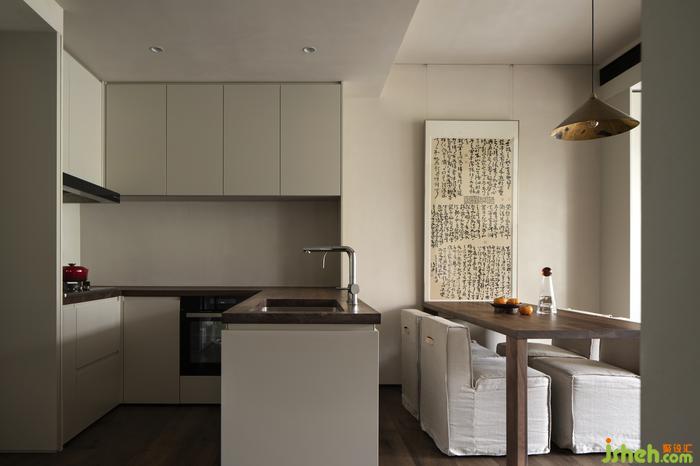 4厘米厚純胡桃實木廚臺面,1.8米長胡桃木餐桌,密字書法、定制純黃銅吊燈,訴說著無以言表的阡陌流年。