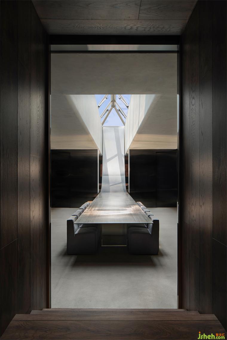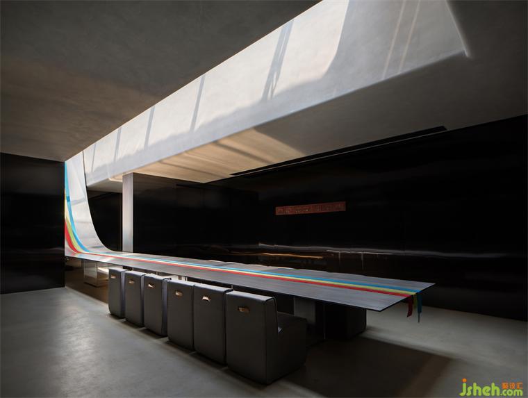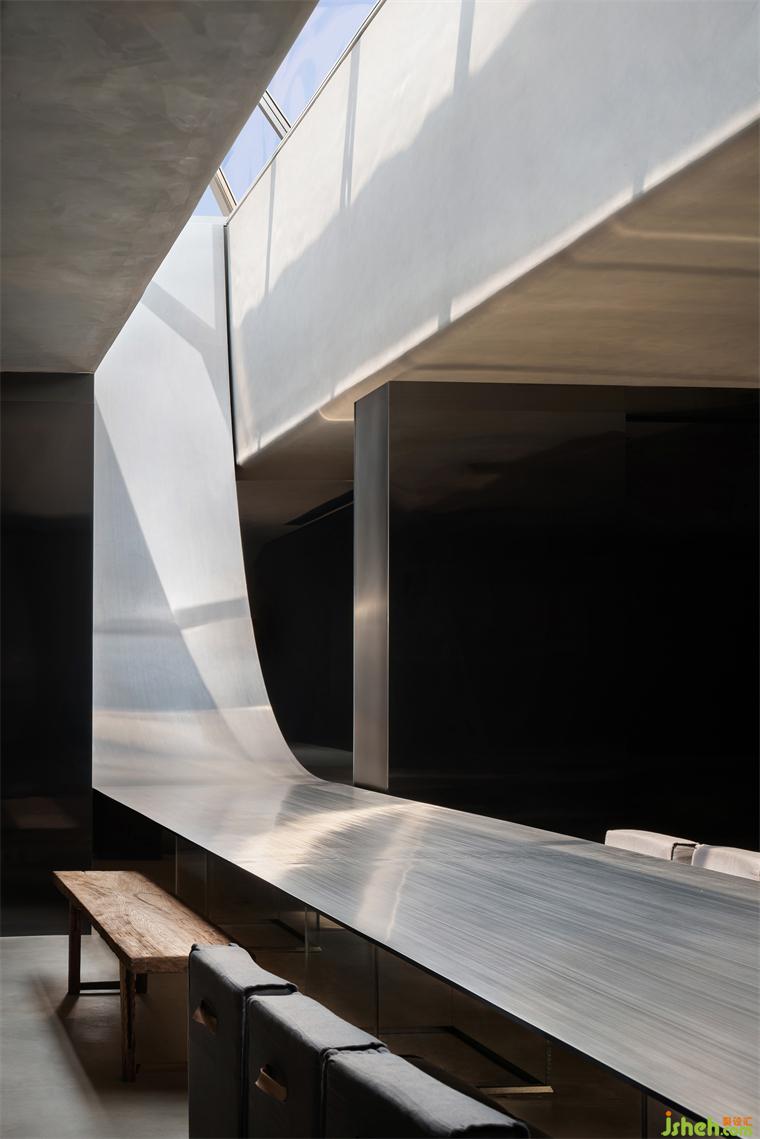 咬定青山,立根巖中。無(wú)畏無(wú)懼,勇攀高峰。中山展廳設(shè)計(jì)企業(yè)向上的路,用果敢鋪就。近15m長(zhǎng),1.2mm厚的灰色不銹鋼板無(wú)縫處理從天而降。登頂?shù)恼鞒蹋脽o(wú)畏的心回應(yīng)。