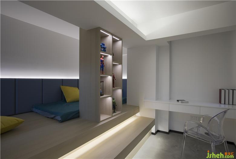 小孩房榻榻米邊上設置了軟包保護,同時簡化了空間脈絡,把盡可能多的空間騰出來,讓收納柜里漫威宇宙的英雄人物陪伴孩子在大片的空地上自由自在的玩耍。