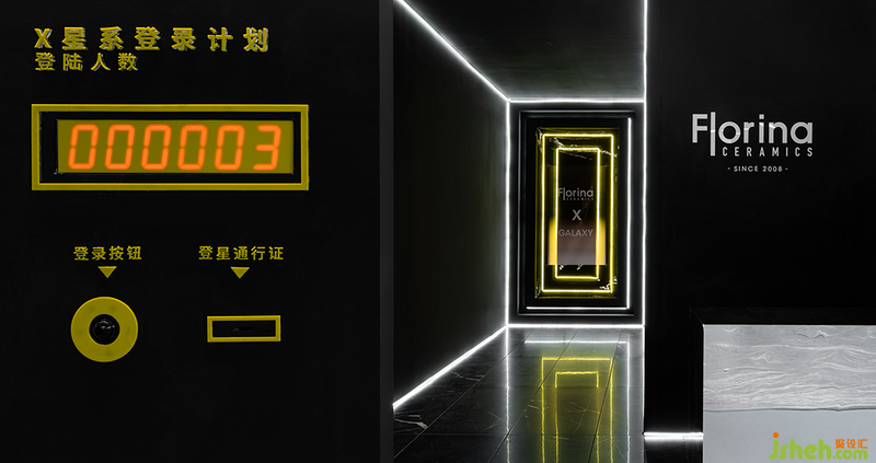 在展位內(nèi)部,分布著代表“費羅娜X星系”的主體裝置以及代表其他產(chǎn)品系列的小裝置群,品牌瓷磚、鏡面與黃色發(fā)光亞克力相互映襯,為規(guī)則排布的方塊矩陣加入酷炫視覺效果。