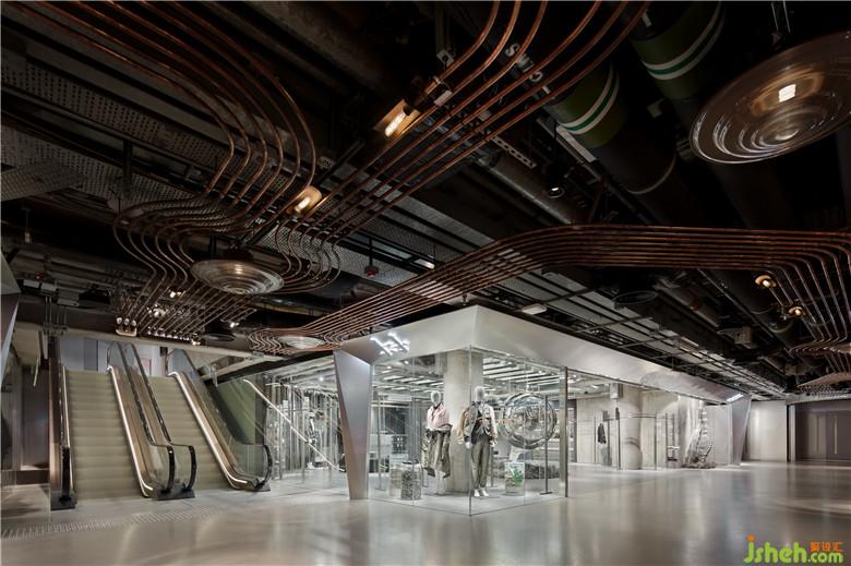 K11 MUSEA地處1910's年代香港主要貨倉碼頭藍(lán)煙囪碼頭舊址,其負(fù)一層空間位于海平面以下,工業(yè)風(fēng)格的裝飾令整層建筑空間本身便呈現(xiàn)出海底工業(yè)遺跡般的獨特視覺感受。