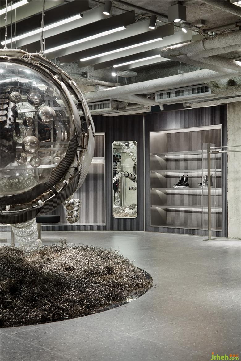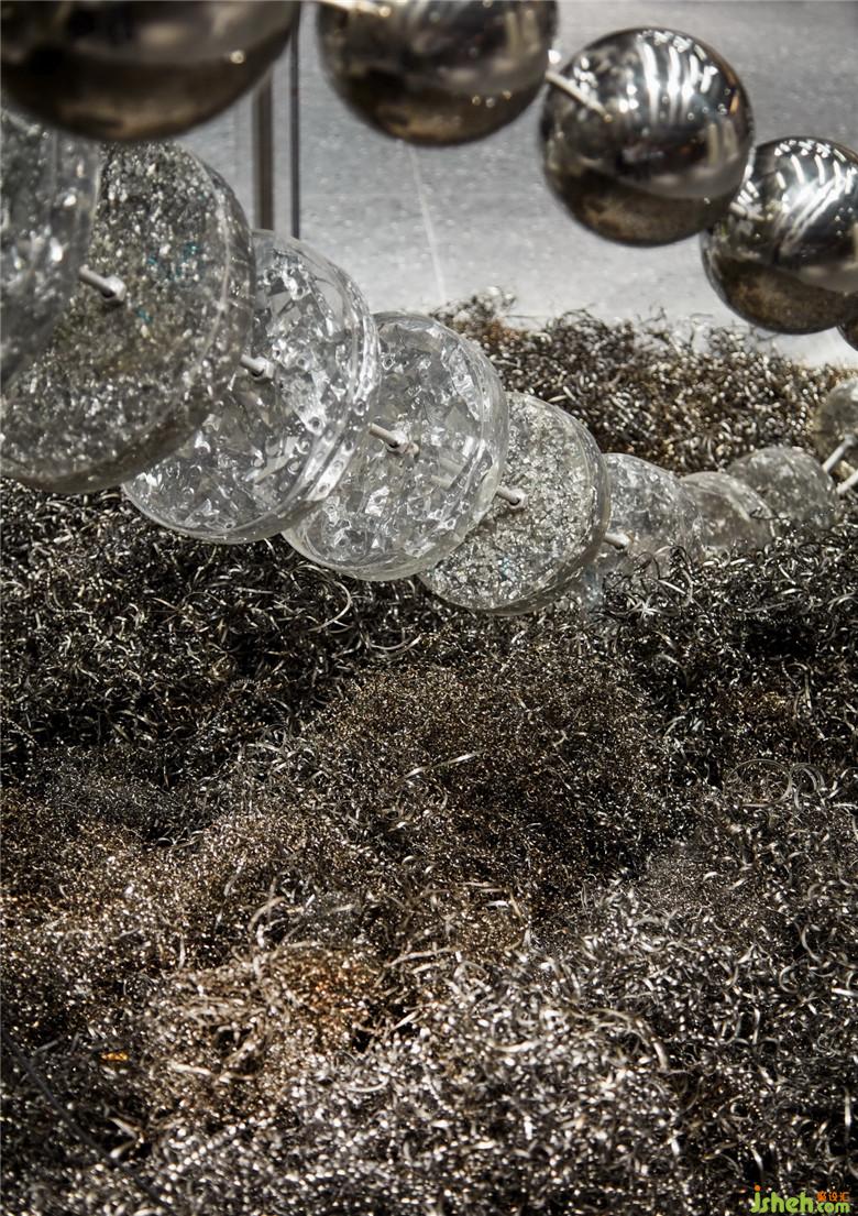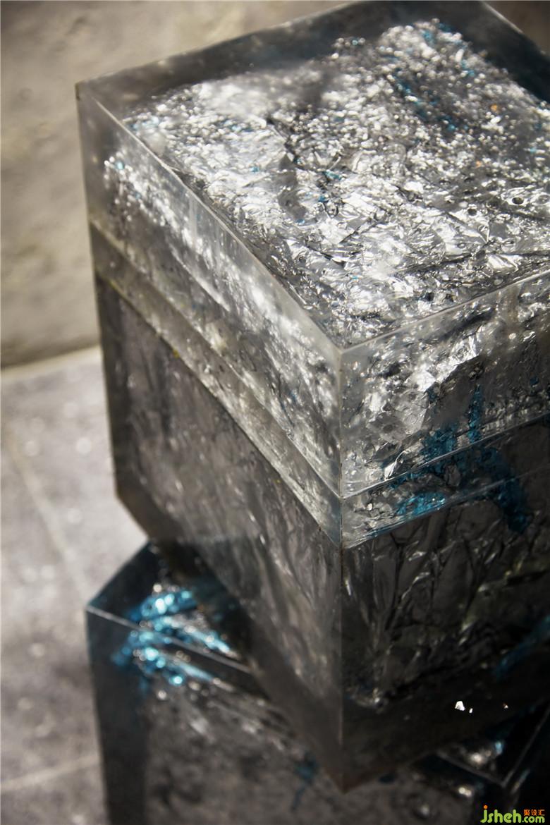 廢棄鋁片條被放入特定容器中并灌入樹脂,像是生于更迭時(shí)代中的人造琥珀,被封存的物質(zhì)成為了時(shí)間的化石。同樣的做法也被用于制作陳列道具,出現(xiàn)在其他的空間局部中與裝置形成呼應(yīng)。