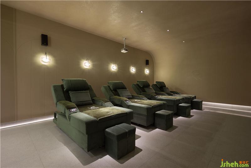 △SPA房的浴池上方使用磨砂玻璃,內(nèi)嵌LED屏幕持續(xù)播放樹蔭斑駁的光影動態(tài)效果。