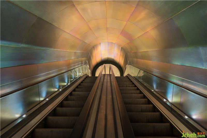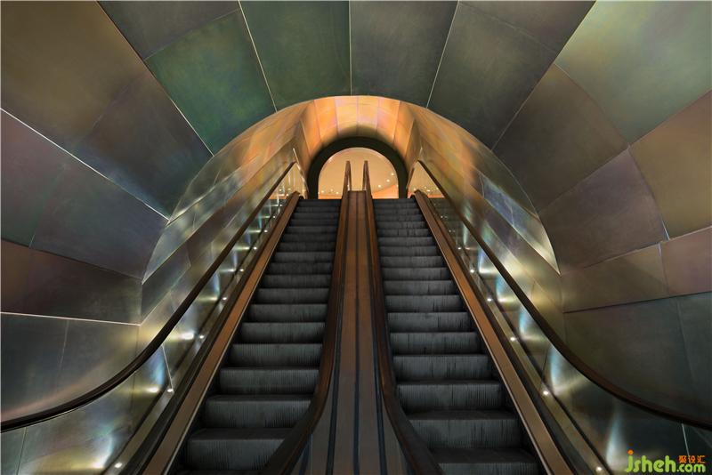 店面的另一個入口是商場內(nèi)的手扶梯,以鍍彩鋅材質(zhì)包裹形成整體的洞口形態(tài),創(chuàng)造故事主線之外的彩蛋空間。