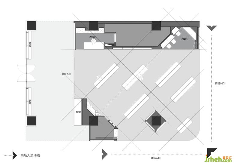 ▲空間布局以對(duì)角線的形式斜向呈現(xiàn),保持通透的開放性,以使更大范圍的人流接觸。