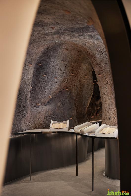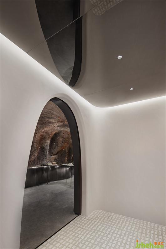 在表達手法上,如何平衡具象和抽象之間的關(guān)系?燕洞位于整個體驗動線的入口處,以粗礪的巖洞結(jié)合金屬材質(zhì),同時實現(xiàn)原始力量感和現(xiàn)代感。