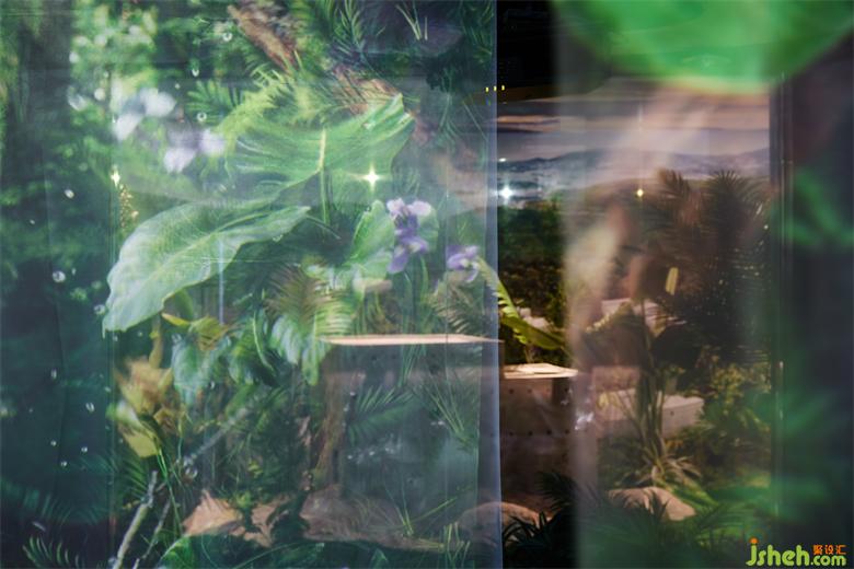雨林區(qū)的營造更符合當下人們拍照打卡的習(xí)慣,由Seen Vision呈現(xiàn)的互動影像畫面投射在若隱若現(xiàn)的紗幕上,人一旦經(jīng)過,紗幕上群鳥飛舞,讓人仿佛置身于熱帶雨林之中。