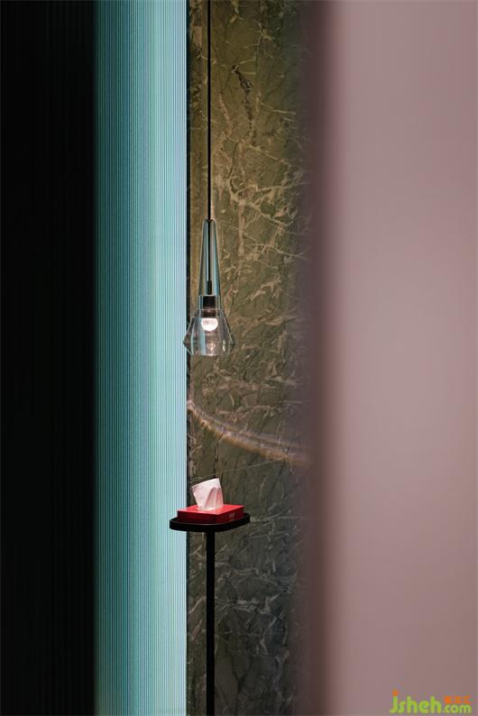 隨空間動(dòng)線轉(zhuǎn)換,設(shè)計(jì)師用不同的材質(zhì)和肌理進(jìn)行細(xì)節(jié)強(qiáng)調(diào),通過(guò)折線的鋪排、幾何線條的特定組合,延續(xù)著空間的張力。