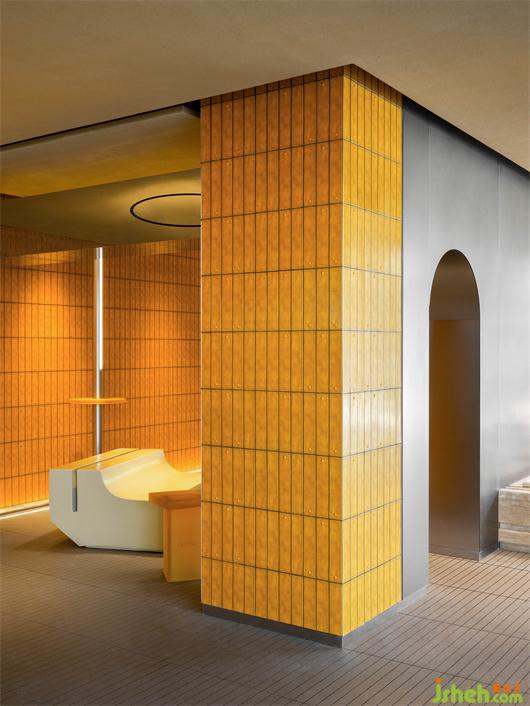 具有標(biāo)志性意義的拱門被金屬材質(zhì)包裹,宛如一道時(shí)空之門。喜茶設(shè)計(jì)穿過這道拱門進(jìn)入內(nèi)里空間,定制的黃色手工磚上,倒模形成的圓點(diǎn)凸起對(duì)應(yīng)著秦俑士官盔甲特有的鱗片圓點(diǎn),那些模糊的歷史文化印記再次浮現(xiàn)。