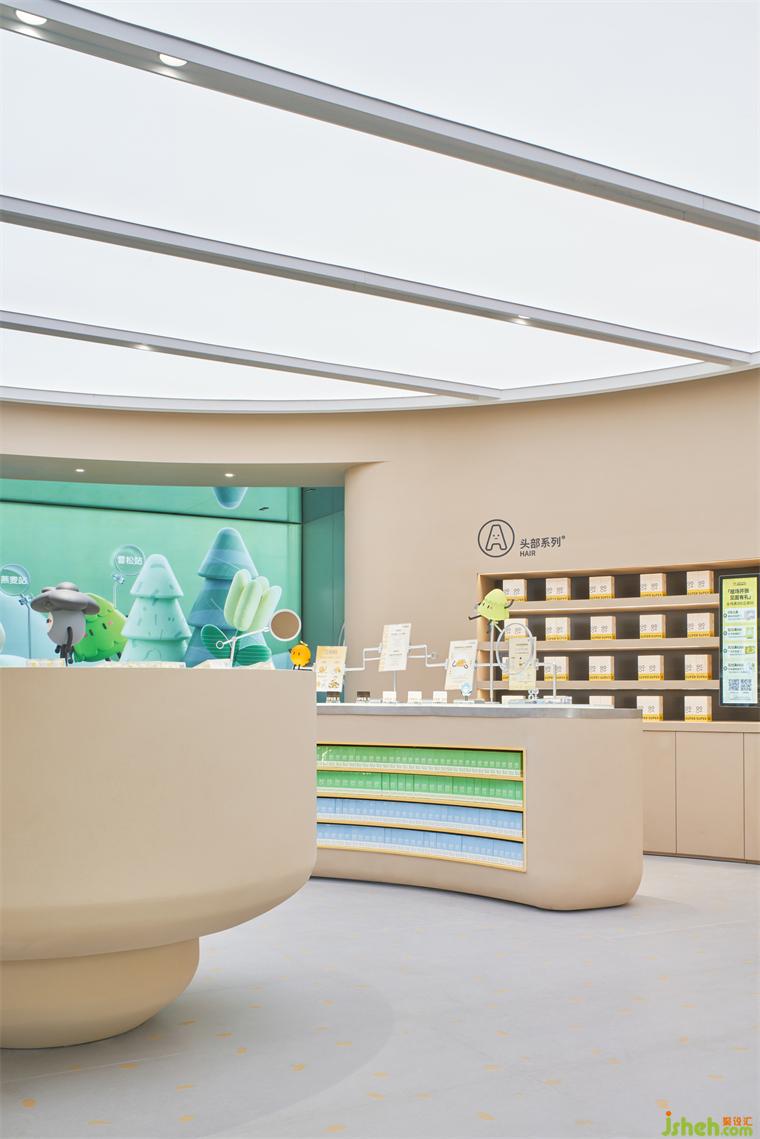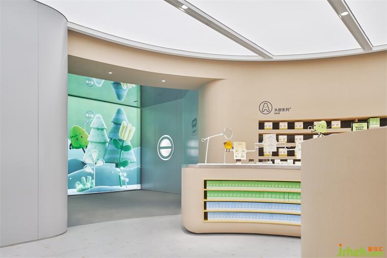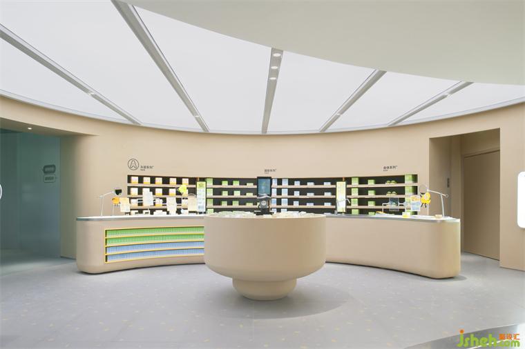 品牌強調(diào)特有A+B個性護膚理念,裝修設(shè)計不同的基礎(chǔ)產(chǎn)品加精油組合為肌膚護理創(chuàng)造更多的可能性??臻g功能布局同樣滿足兼容性和高效性,以花盆造型設(shè)計的圓形導臺陳列精油產(chǎn)品作為功能和視線的核心,裝修設(shè)計在垂直和平行方向上與基礎(chǔ)產(chǎn)品導臺和陳列柜形成不同的組合,方便消費者輕松搭配個性護膚方案。