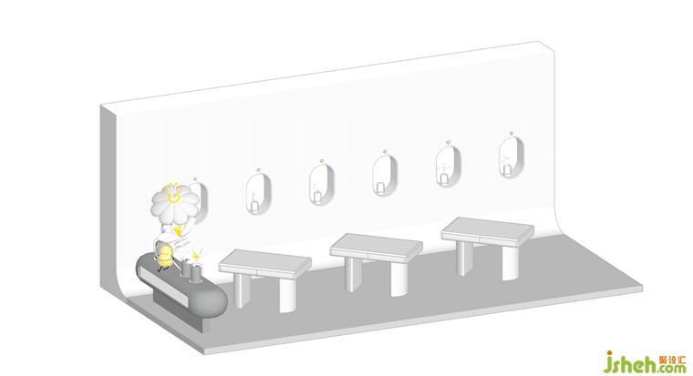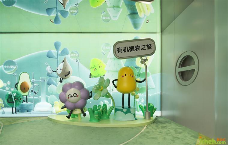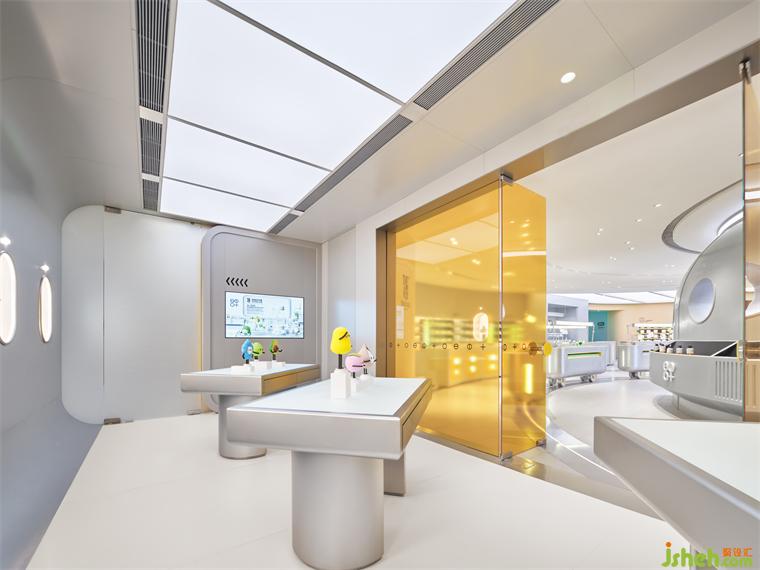 在空間動線的末端,設(shè)計師不忘緊扣腳本,將消費者帶入到故事腳本的高潮部分。設(shè)計師巧妙地將品牌的植物IP以裝置藝術(shù)的設(shè)計手法融入狹長的回廊中,通過動態(tài)燈箱模擬植物在實驗室中場景,裝修設(shè)計光源的閃動模擬植物呼吸的韻律,展現(xiàn)出植物蓬勃生長的強大能量。在沉浸式的場景中,消費者潛移默化地將植物的生長律動與品牌強調(diào)的天然純粹進行聯(lián)想,裝修設(shè)計從而對品牌有了更清晰和深入的感知。