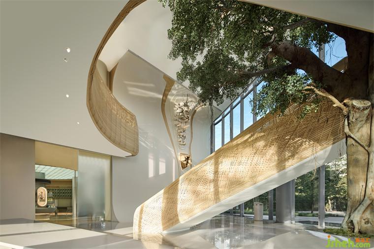 過(guò)去,人們?cè)诖蹇诖箝艠?shù)下納涼嬉戲,現(xiàn)在,年輕人在咖啡奶茶店門(mén)口社交休閑,那些看似被遺忘的集體印記,正在以一種新的方式存在。立品以“老樹(shù)新生”為概念,在展廳中將過(guò)去的“敘事”以現(xiàn)代語(yǔ)境重新演繹,裝修設(shè)計(jì)樹(shù)成為空間的精神圖騰,孕育百年龍舟文化的龍溪河片段在空間中延展,大榕樹(shù)下納涼交流的場(chǎng)景被以現(xiàn)代手法復(fù)刻。