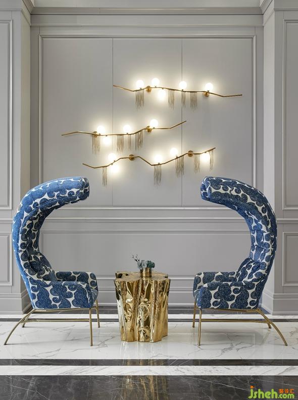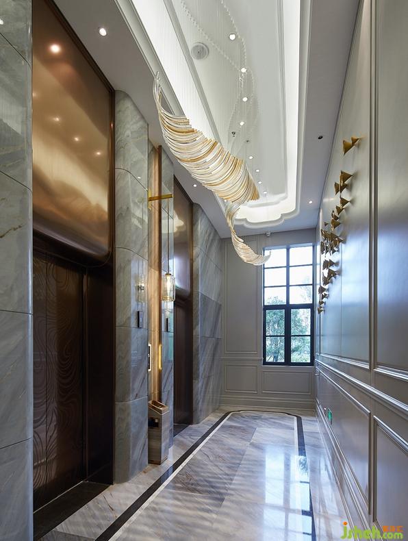 電梯延廊高垂“貝殼”掛飾,增加走廊的視覺延長性,拉伸空間氛圍,使人身臨其境而覺空間通暢,舒心愉快。設(shè)計公司