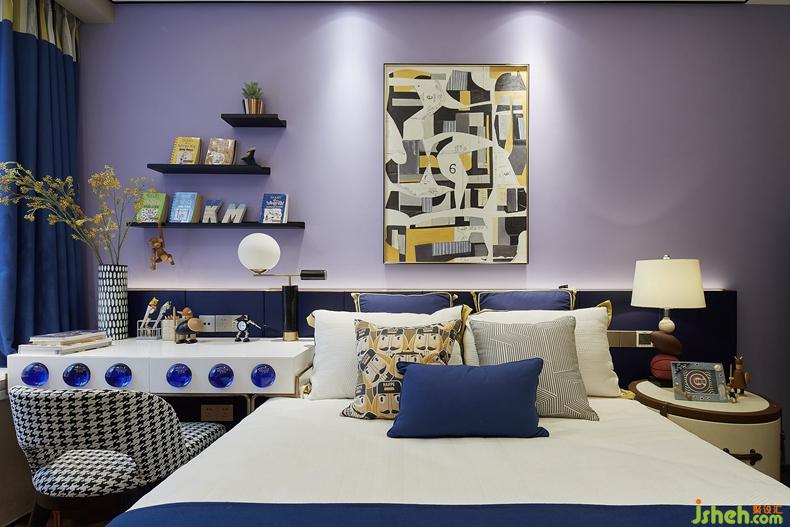兒童房色彩鮮艷跳躍,不同飽和度的紫色、藍色交相點綴,凸顯出空間小主人自由活潑的性格心智。Children room colour is bright-coloured jump, the purple of different saturation, blue ornament, highlight gives dimensional small host free and lively disposition mental.