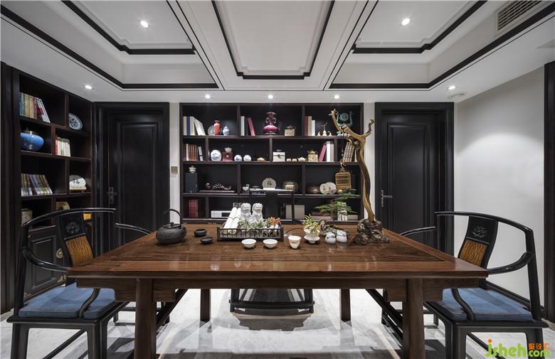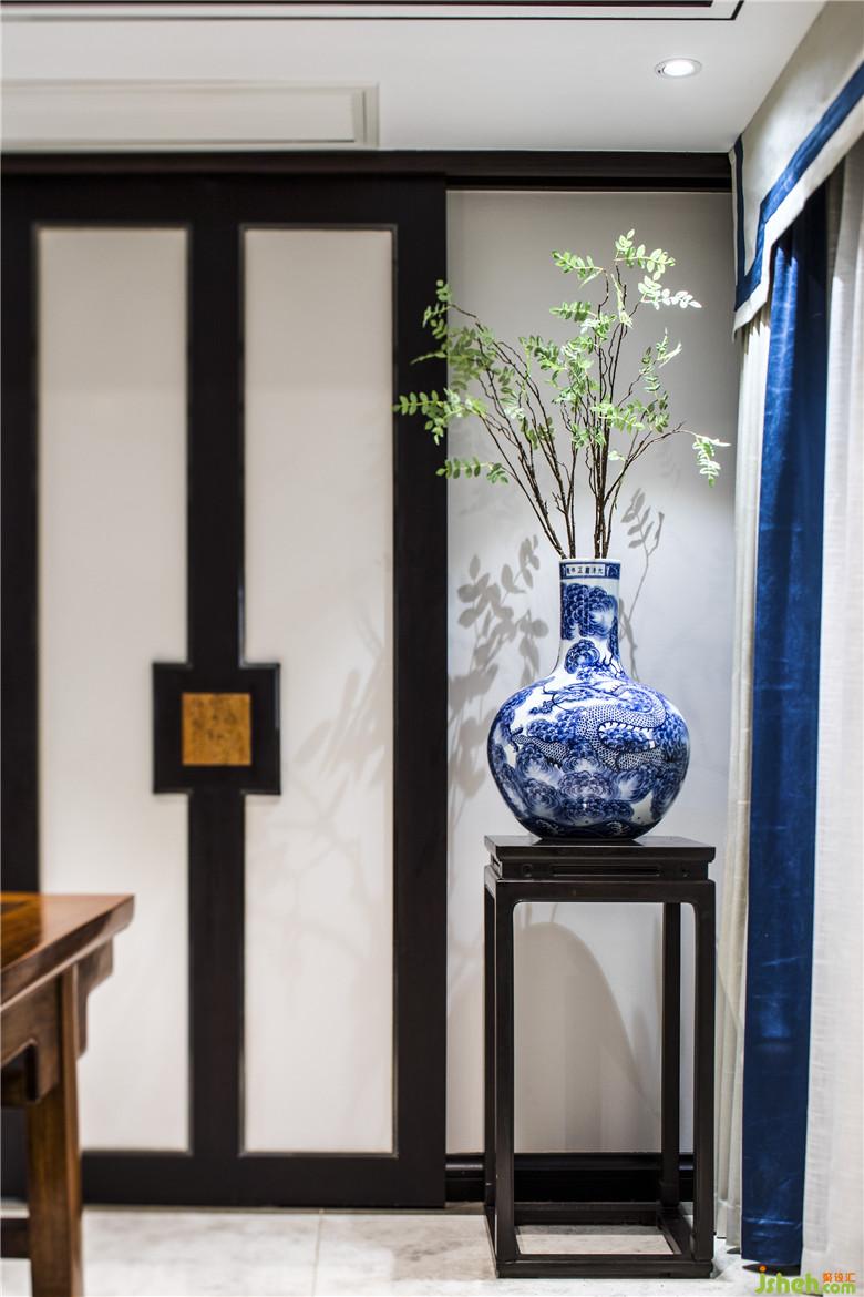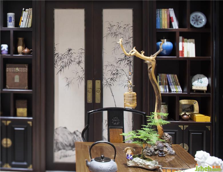 東方元素畫面裝飾和戲劇化撞色組合,古樸紋樣與靈動線條和諧融合,自然取材在東方悠韻中悄然綻放。書架運用博古架的形體,鏤空的對稱設(shè)計使書房更加通透,太師椅造型圓潤靈動,端莊大氣?;◣咨蠑[放的一件青花瓷配上鮮嫩欲滴的枝條,室內(nèi)設(shè)計師使空間和感觀都溢出向上生長的力量。