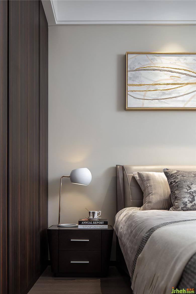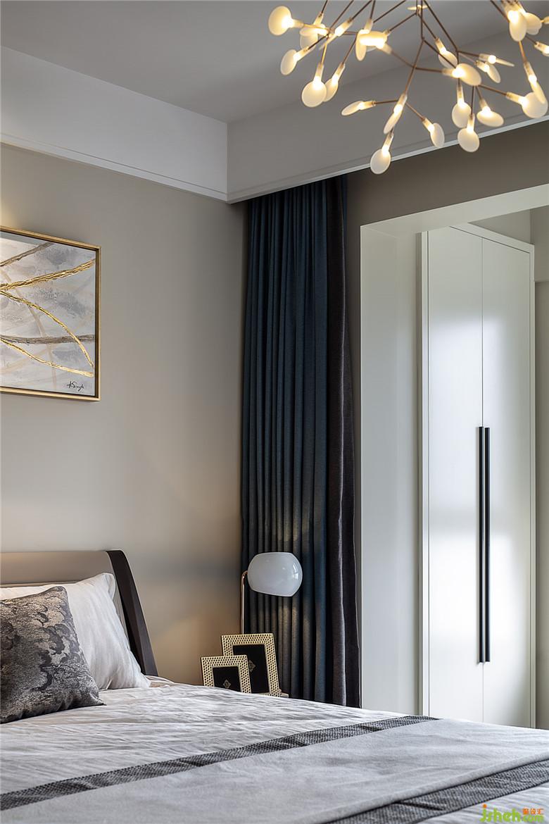 次臥,淺駝色的墻面,胡桃木的柜門,淺灰的床品。室內(nèi)設(shè)計師讓空間有限的臥室也顯得溫情脈脈。整個臥室配色十分簡潔沉穩(wěn),亦不乏明快。蒲公英吊燈,讓臥室又顯得有些浪漫。