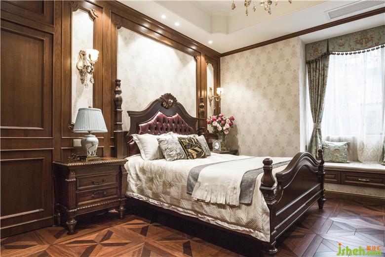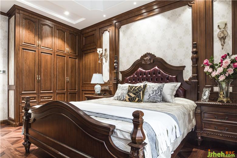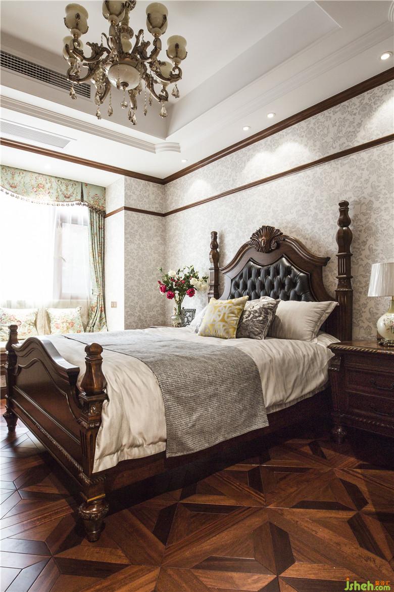 次臥室內(nèi)設(shè)計師采用同系列美式經(jīng)典家具,配合墻面手工藝術(shù)涂料的襯托,溫馨柔