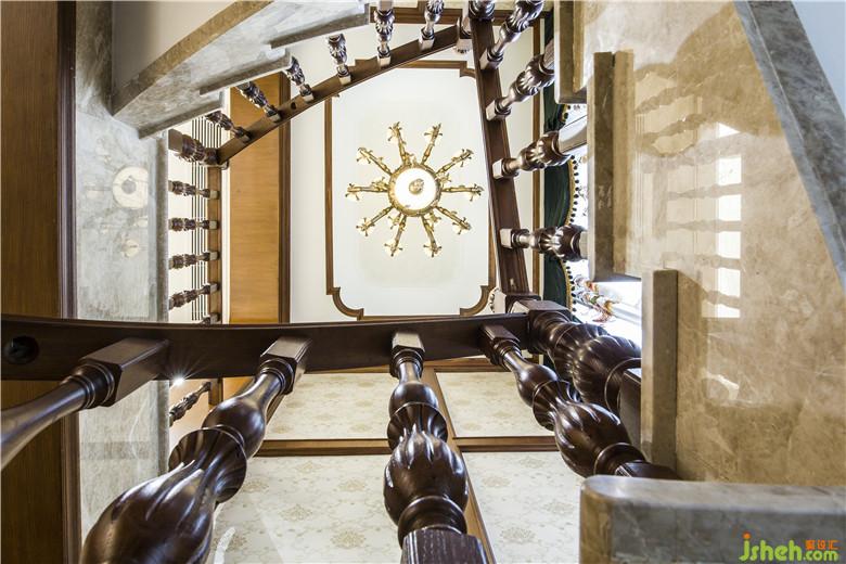旋轉(zhuǎn)樓梯設(shè)計配合頂面的造型處理尤其大氣,復(fù)古樣式的樓梯欄桿扶手,曲折圓潤而上,將空間劃分得通透而豁達(dá)。