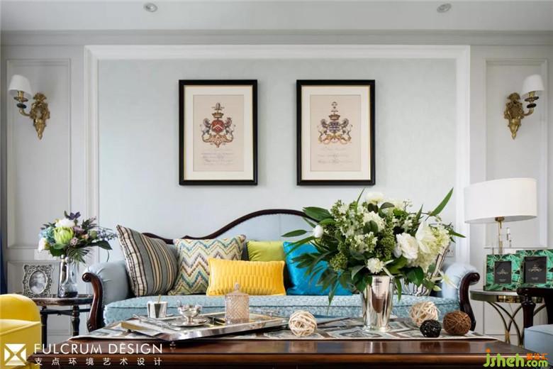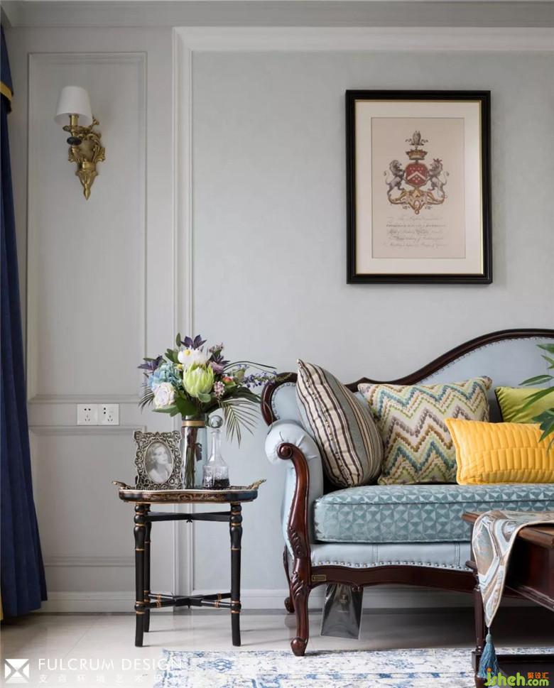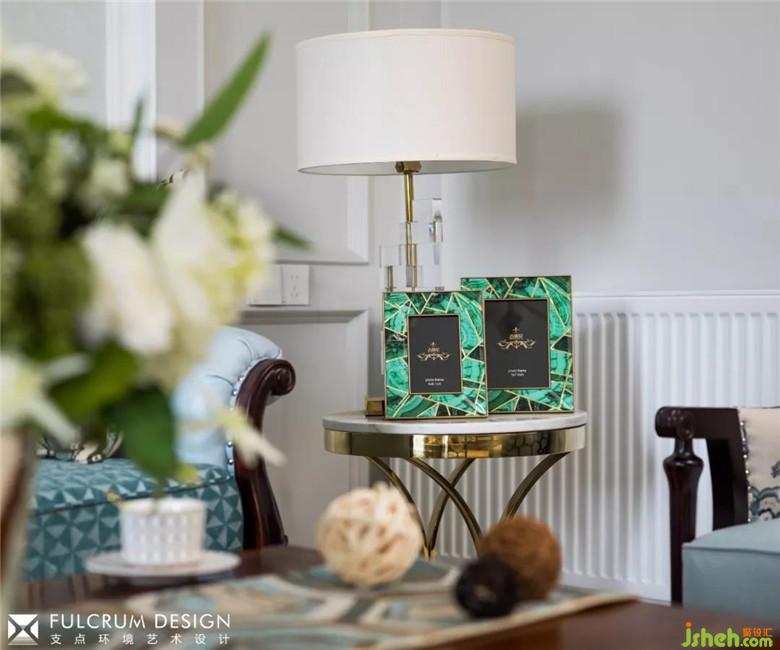 客廳里淺綠的沙發(fā)背面的暗紋墻紙配合淺灰的墻面,顯得清爽淡雅。帶有傳統(tǒng)美式元素的家具,純銀的古董茶杯,帶貴族族徽的裝飾畫跟現(xiàn)代風格的墻面大理石,掛飾相映成趣,給人一種時空穿梭感。