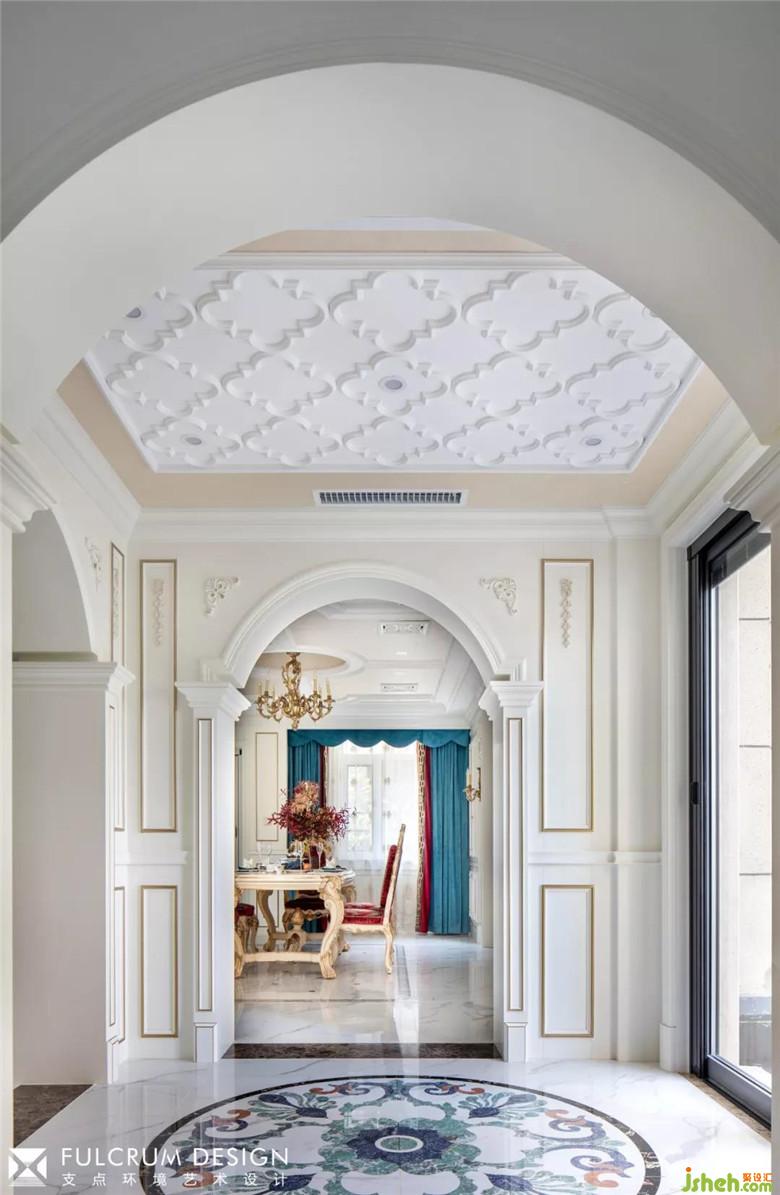 三面拱門,歐式柱托,圓形的地面大理石拼花,白底金邊的墻板盡顯華麗氣質(zhì)。