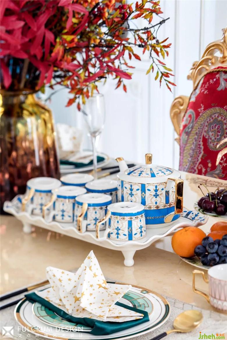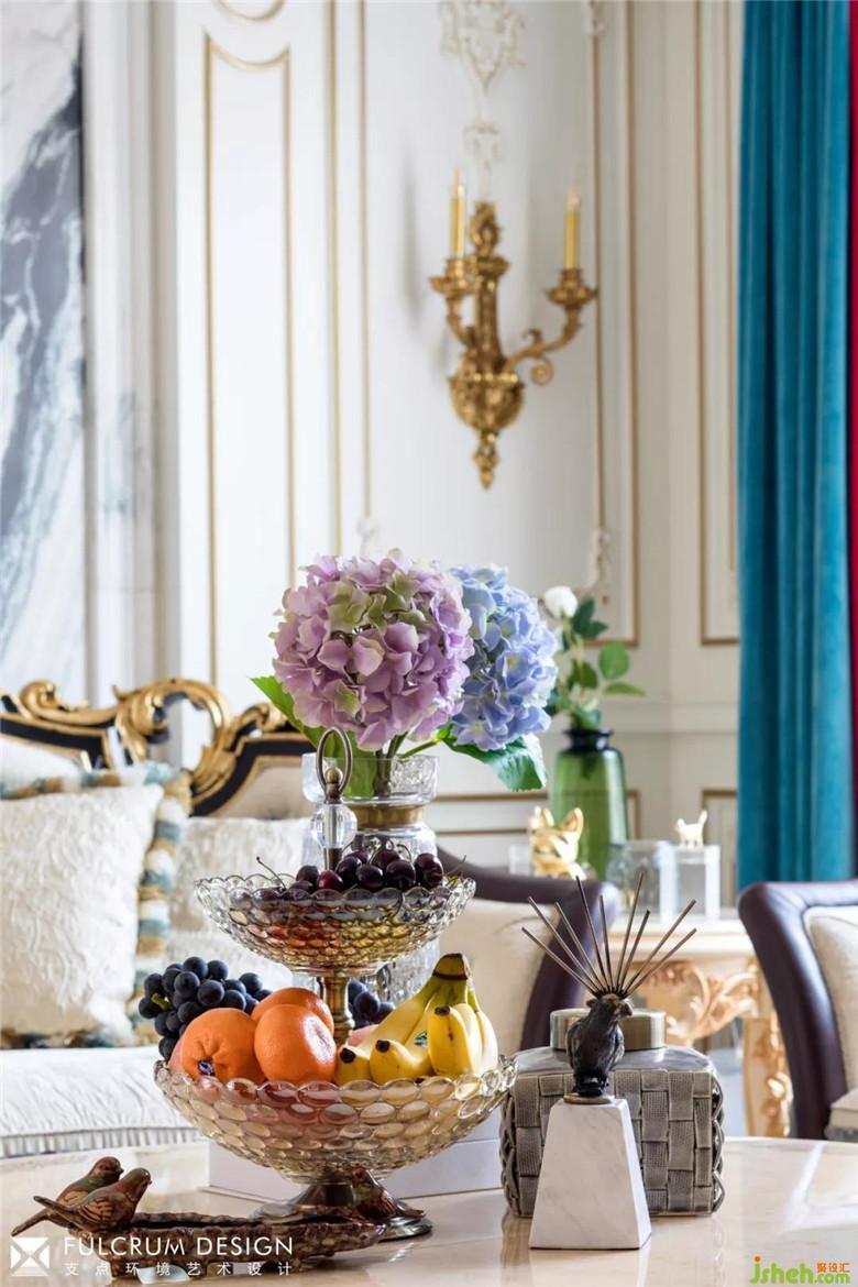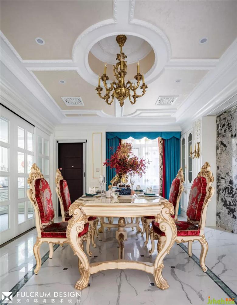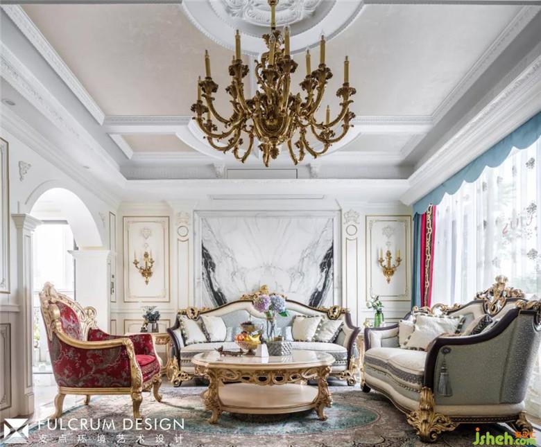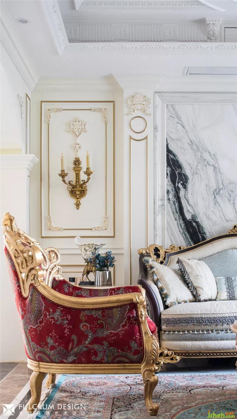 黃銅鎏金的吊燈,紅、藍綢面的沙發(fā),繁復的金色雕花讓整個客廳雍容華貴。白色天然大理石的拼接背景顯得奢華而不俗。松石色的密織勾花地毯和花團錦簇的各個角落,透著一絲安托瓦內(nèi)特式的風華絕貌。所有的一切都仿佛將大革命前的凡爾賽宮廷內(nèi)的歌舞升平帶入了現(xiàn)代的居家生活。