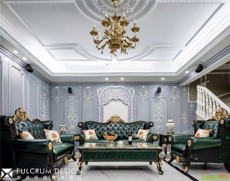 雪松綠的皮沙發(fā)配合巖石灰的原木墻板,外加精致的雕花分色工藝,金色的植物雕花點綴其中,恰到好處地將古典與現(xiàn)代糅為一體,更好的迎合了主流趨勢。