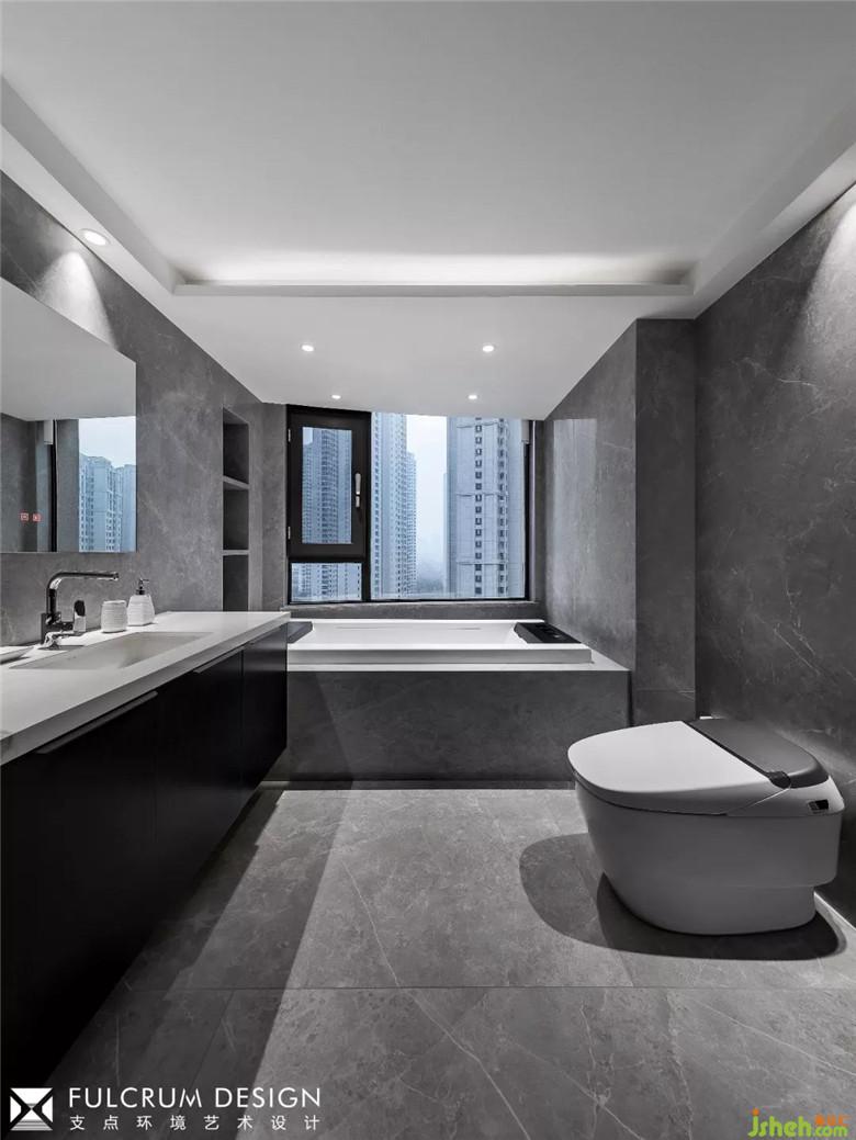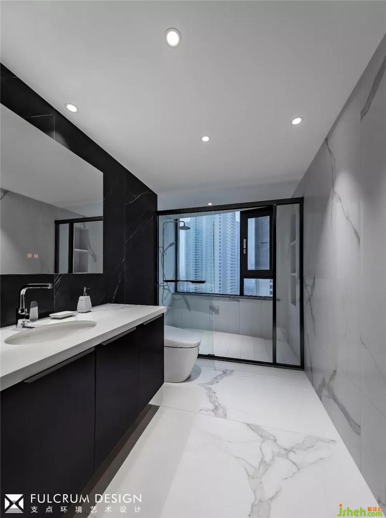 衛(wèi)生間,色彩跟線條都遵循著極簡,傳達(dá)著一種細(xì)致又隨心的生活方式,裝修公司大量運(yùn)用黑色增加空間對比度,讓空間呈現(xiàn)出一種強(qiáng)烈的視覺沖擊感。