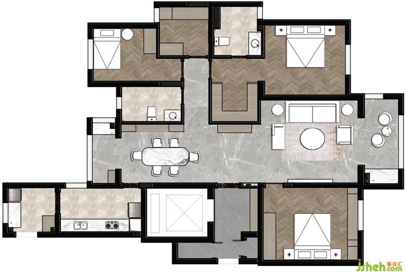 2、儲(chǔ)藏空間配置安排??筒蛷d公共區(qū)都配備儲(chǔ)藏柜以滿(mǎn)足后期零碎物件收納,便于后期保持居家整潔。房間內(nèi)為男女主人分別配備了衣帽間,以滿(mǎn)足兩位時(shí)尚達(dá)人的衣物安置需求,預(yù)留的兩間次臥室也各自配套了儲(chǔ)藏柜。