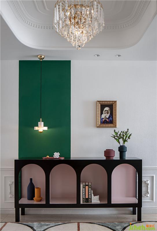 白色的墻面勾勒著精致的線條,刻意用不對(duì)稱(chēng)的手法局部鋪設(shè)了一片祖母綠的跳色,增添了時(shí)尚的氣息。精心挑選的玄關(guān)柜,擁有建筑連廊的美感,黑加粉色經(jīng)典配色也與空間相得益彰。金色的吊燈與畫(huà)框,再配上精致的飾品搭配,給空間增添了點(diǎn)睛之筆。