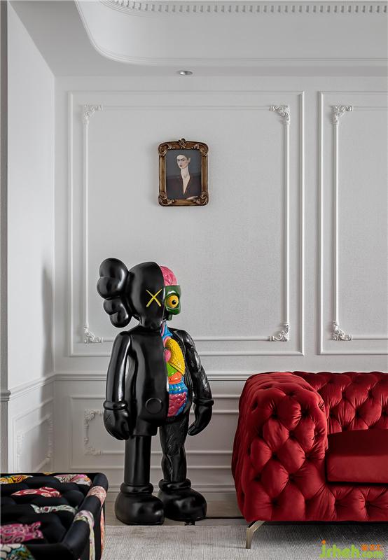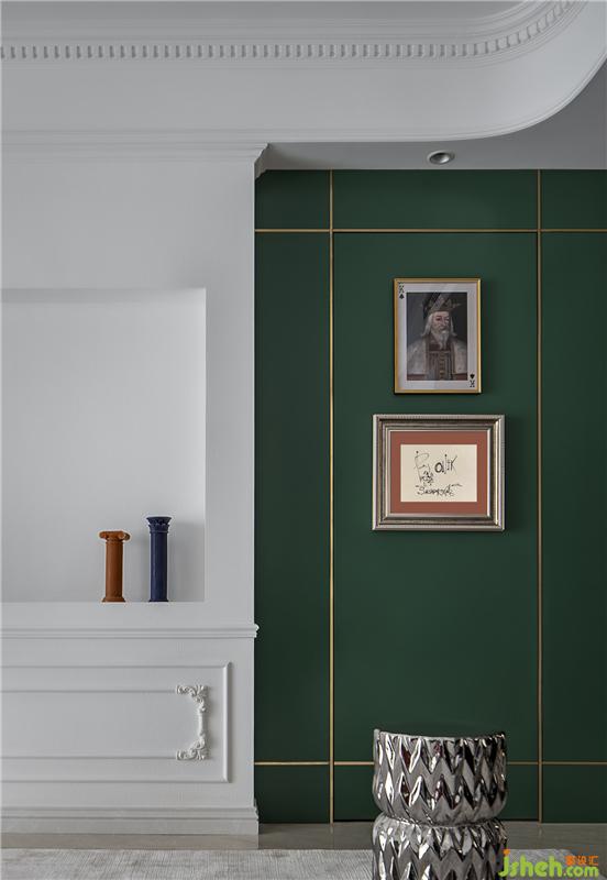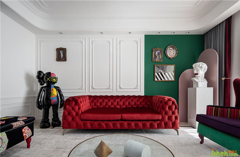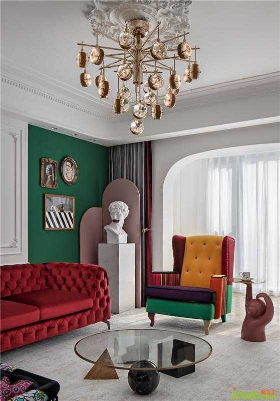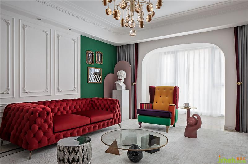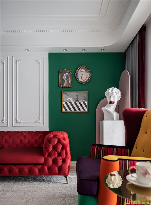 ▲這是一個(gè)色彩豐富的客廳。亮白色的環(huán)境打造了一個(gè)透明的舞臺(tái),純凈的墻面上線條勾勒出優(yōu)雅的法式風(fēng)情,濃烈的紅色天鵝絨沙發(fā)與局部的綠色墻面打造一個(gè)充滿(mǎn)浪漫與熱情并存的派對(duì)樂(lè)園。