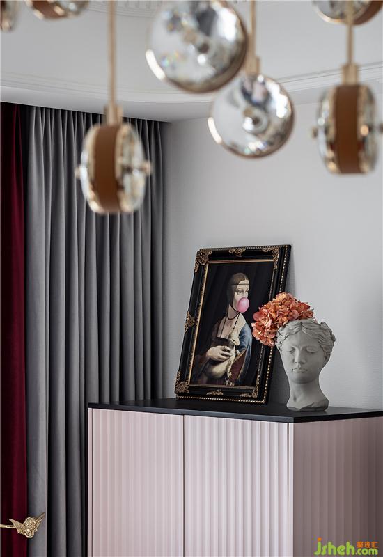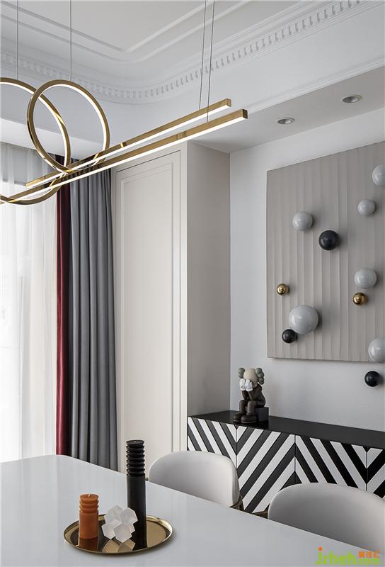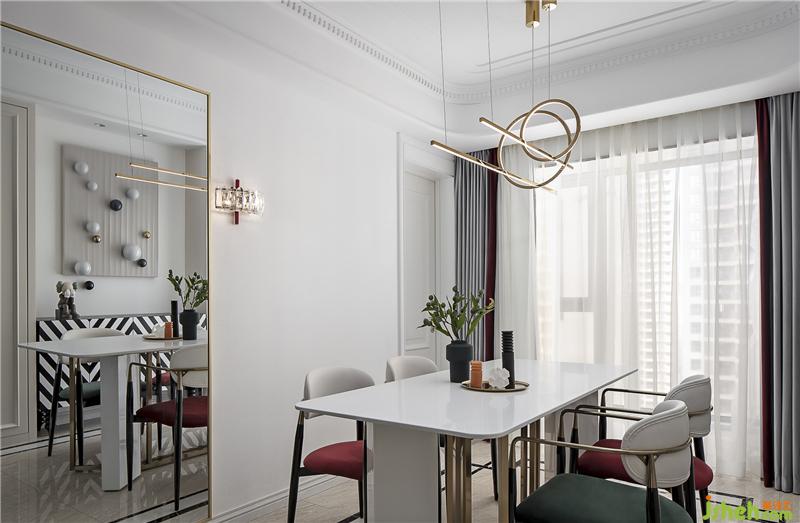 ▲在亮白色系的環(huán)境下,紅綠色搭配的餐椅與客廳配色呼應(yīng),集聚沖擊力的黑白配色邊柜成為亮眼的點(diǎn)綴,而上方的現(xiàn)代藝術(shù)作品帶來極大的樂趣和新鮮感。另一面留白的墻面,選用鏡面作為裝飾,映射了這些豐富的裝飾,能夠最大的提高視覺沖擊力,拓寬視野的同時,豐富空間的層次感。