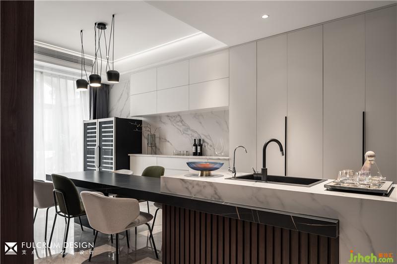 四米多長(zhǎng)的超長(zhǎng)島臺(tái),滿足朋友親戚來小聚圍坐,品一杯酒、在陽臺(tái)上看看風(fēng)景,生活因?yàn)槿说那楦卸鵁崃?、豐盈。