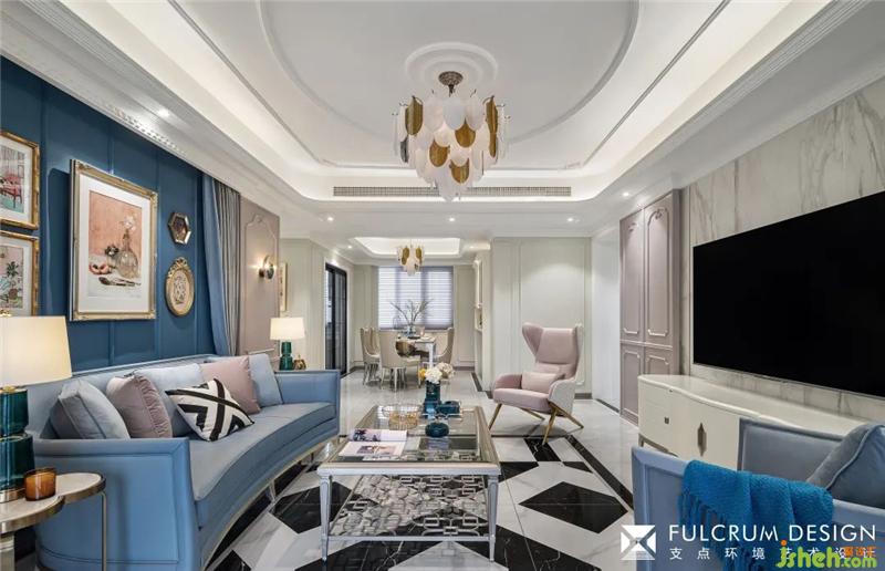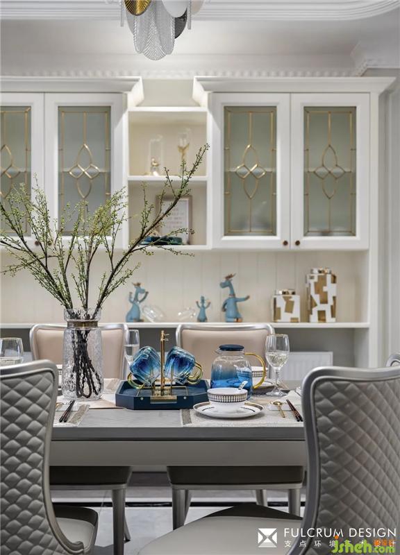 電視背景墻兩邊與沙發(fā)背景墻兩邊用同樣的飾面造型,藍(lán)色有安靜、沉穩(wěn)之感,設(shè)計(jì)師運(yùn)用不同明度、灰度的藍(lán)色在墻面硬裝、家具飾面和飾品擺件,用來中和大量飾品、擺件產(chǎn)生的繁瑣感受,令人產(chǎn)生神清氣爽、心曠神怡之感。
