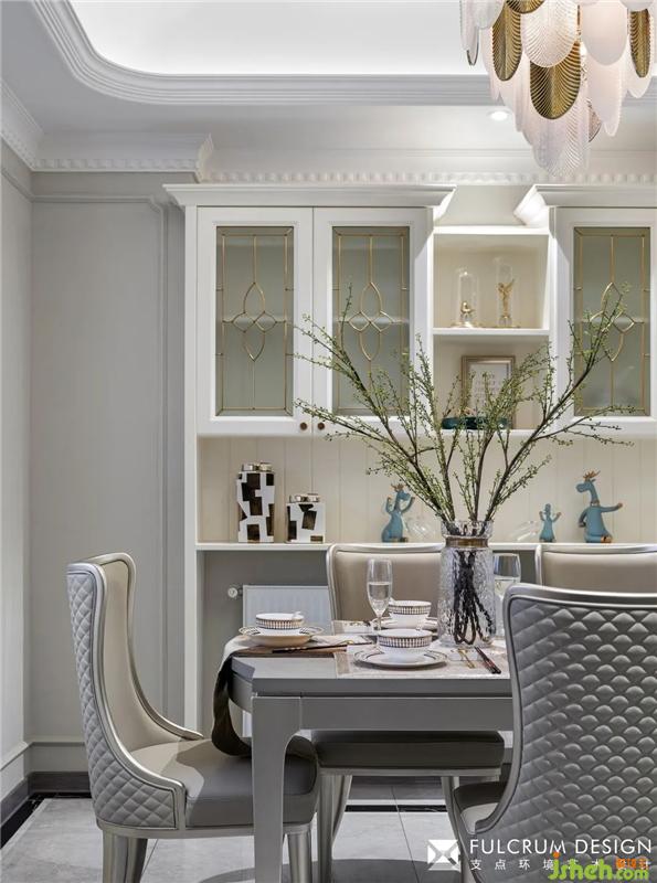 按照現(xiàn)場暖氣設(shè)備的尺寸、位置,設(shè)計(jì)餐邊柜的分隔形式,把設(shè)備完美隱藏。