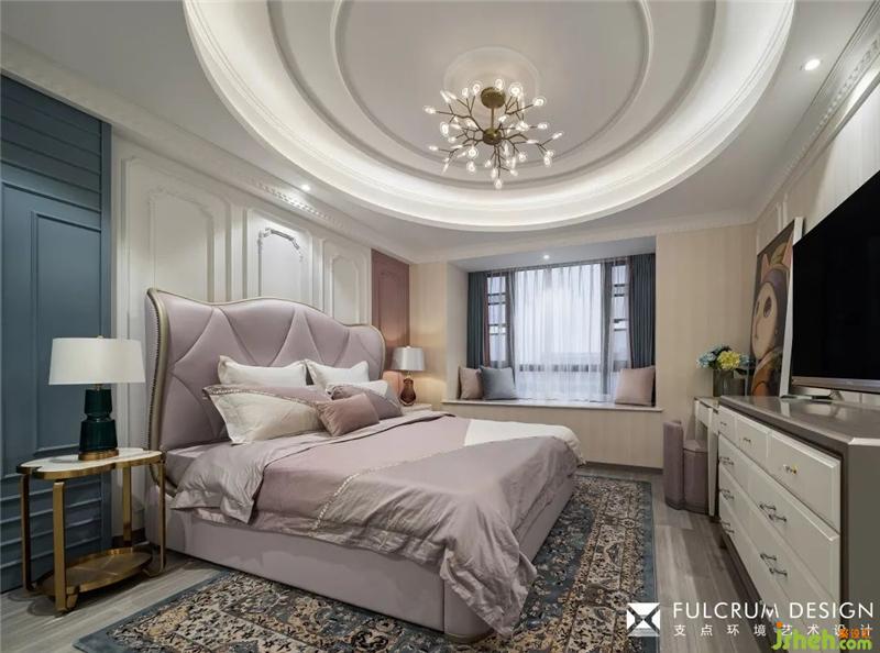 圓形吊頂取自“天圓地方”的概念,旨在為夫妻倆打造屬于他們兩人的一方天地。床頭邊的藍(lán)色飾面板實(shí)際是通往書房的移門。