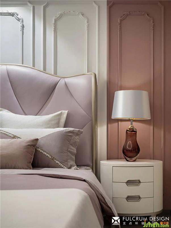 從靠背到架子都是粉色的床品,是男主人想滿足女主人的少女心,投其所好送的禮物,設(shè)計(jì)師綜合男性審美和日后生活考慮,選用了耐看的裸粉色。