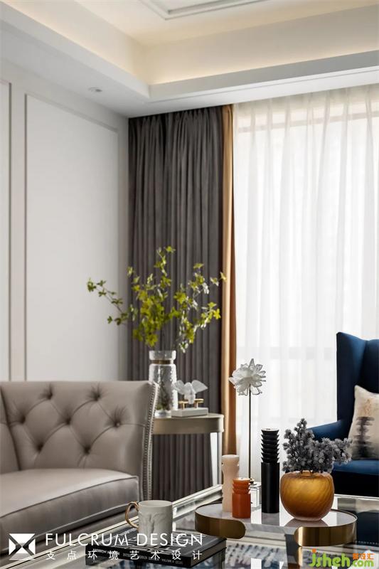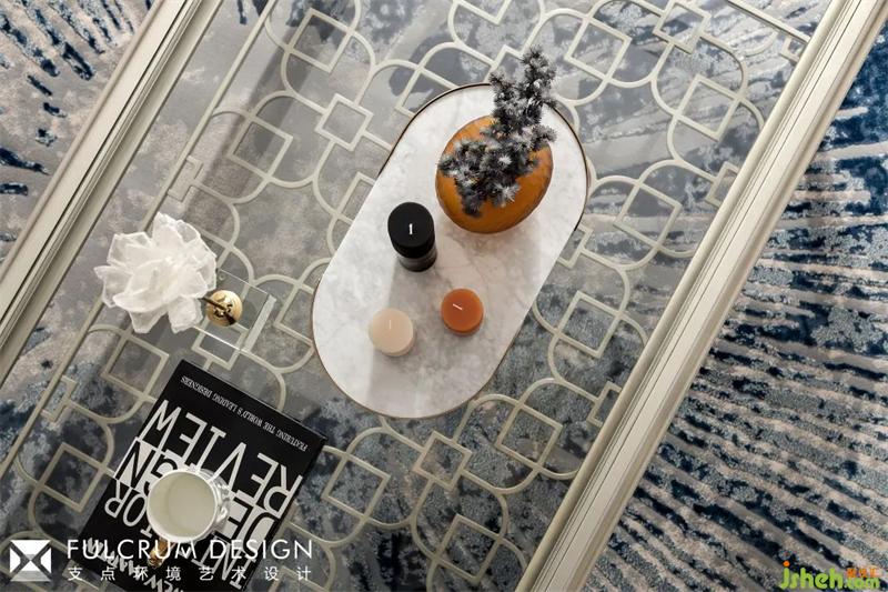茶幾以大面積玻璃材質出現(xiàn),存在感減弱,顯得空間更寬敞,奶白色鋪敘柔和、雅致的視覺感受,以灰色窗簾增添空間沉穩(wěn)的氣質,克萊因藍單人沙發(fā),帶來清爽之感,與地毯在色彩上形成呼應。