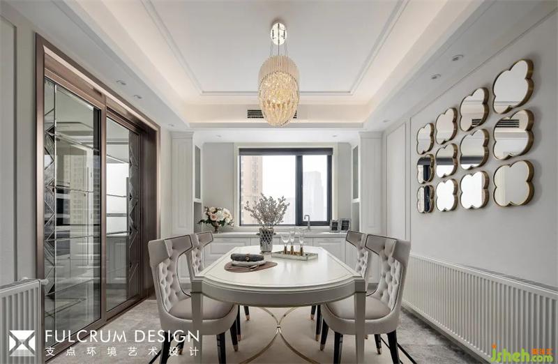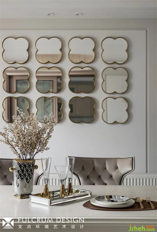 設計師把暖氣設備懸掛,隱藏在白色墻面之中,把梅花裝飾鏡以陣列組合的方式排布在墻面,吸引人的注意力,更加弱化設備存在感,鏡子金屬邊框與廚房梭門形成呼應。